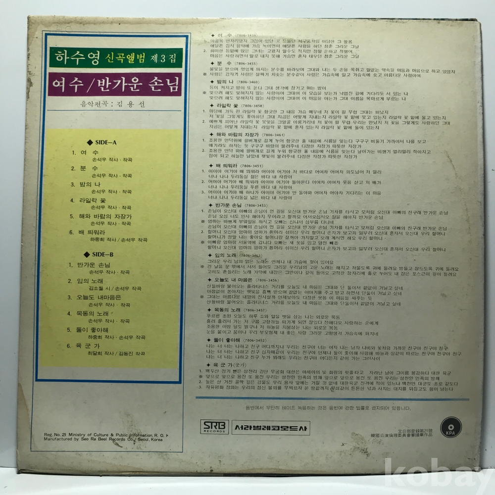 LP 10,720-24 하수영 - 여수 / 반가운 손님 . 자켓 EX 알판 EX+ 78 년 국내반