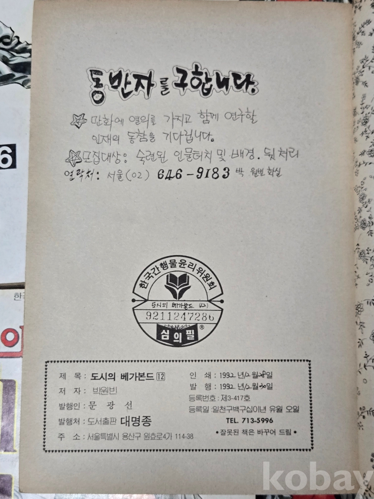 박원빈 글.그림 == 도시의 베가본드 12책 완질 = 1992년