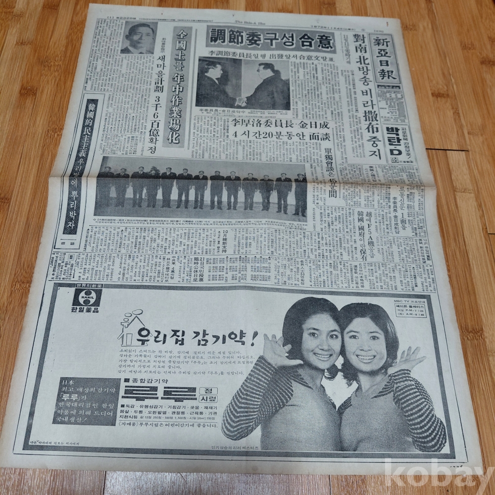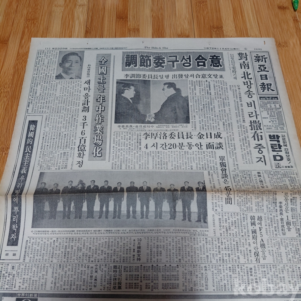 김일성 ㆍ이후락중정부장 회담 정치면 메인기사 신아일보 72년11월4일 올려드립니다