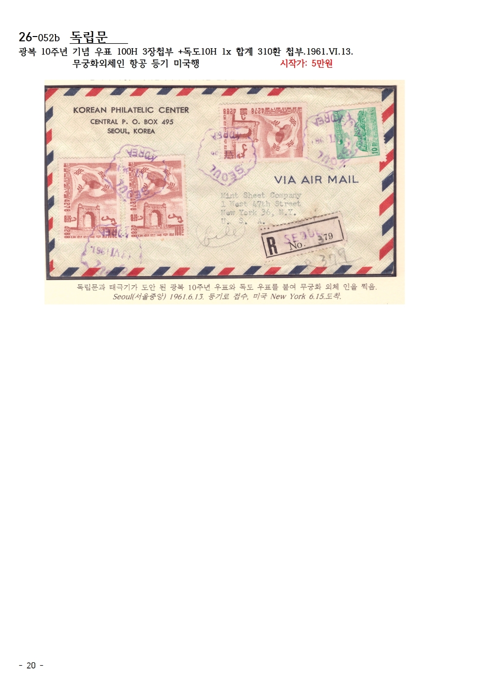 광복 10주년 기념 우표 100H 3장첩부 +독도10H 1x 합계 310환 첩부.1961.VI.13.
