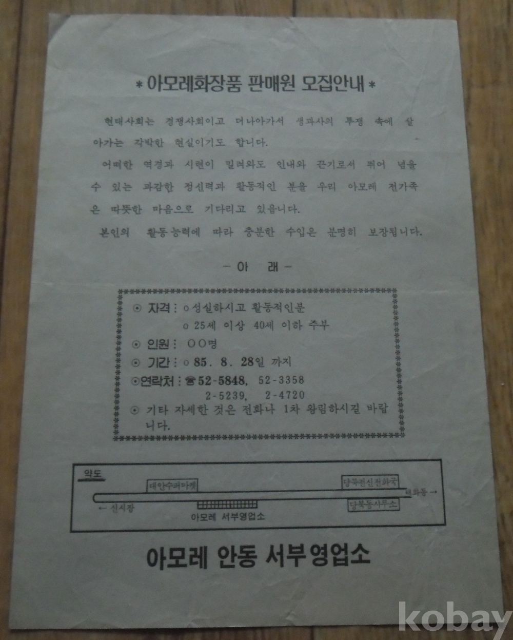 안동자료(전단지): 1985년 아모레안동서부영업소 판매원 모집