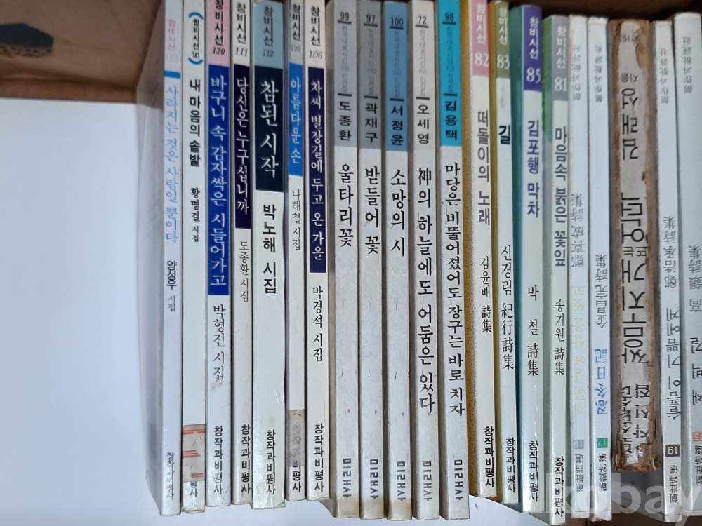 1.새벽길 고은 1978년초판2.저문 강에 삽을 씻고 정희성 1978년초판3.인동일기 김창완 1978년초판4.쌍무지개 뜨는 언덕 김래성 1972년재판5.슬픔이 기쁨에게 정호승 1979년초판70년대 초판본 시집5권 일괄6,개밥풀 이동순 1980년초판7,우짖는 새여, 태양이여 이인석 1980년초판8,묵을 갈다가 김상옥 1980년초판9,봄의 소리 김창범 1981년초판10,벼는 벼끼리 피는 피끼리 하종오 1981년초판11.땅의 연가 문병란 1981년초판12,바람 설레는 날에 인태성 1981년초판13,꽃샘추위 이종욱 1981년초판14,유리창에 이마를 대고 이가림 1981년초판15,전야 이성부 1981년초판16,초혼제 고정희 1983년초판17,사평역에서 곽재구 1983년초판18,하급반교과서 김명수 1983년초판19,차라리 달 없는 밤이드면 변영로 1983년초판20,사월에서 오월로 하종오 1984년초판21,무등에 올라 나혜철 1984년초판22,달넘세 신경림 1985년초판23,논개 정동주 1985년초판24,고두미 마을에서 도종환 1985년초판25,섬진강 김용택 1985년초판26,아도 송수권 1985년초판27,깨끗한 희망 김규동 1985년초판28,바람속으로 이시영 1986년초판29.엉겅퀴꽃 민영 1987년초판30.바다가 보이는 교실 정일근 1987년초판31,꽃산 가는길 김용택 1988년초판32,사랑의 변주곡 김수영 1988년초판33.심석 김선배 1988년초판34,모닥불 안도현 1989년초판35,목숨을 걸고 이광웅 1989년초판80년대 초판시집 30권 일괄