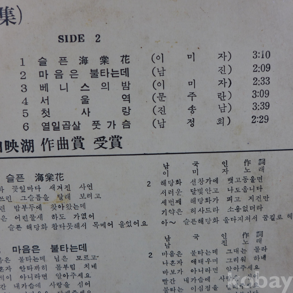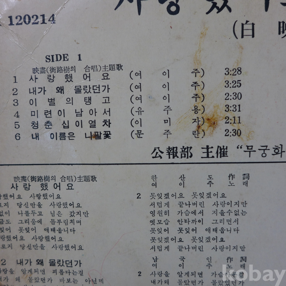(귀한)LP음반: 영화 가로수의 합창 주제가 여의주의"사랑 했어요" 및 이미자의"슬픈 해당화"등 수록앨범