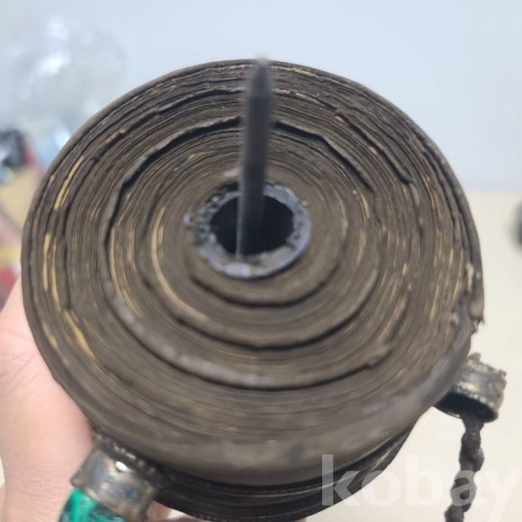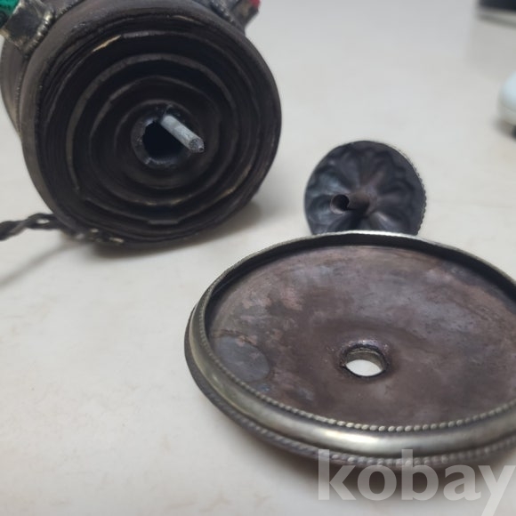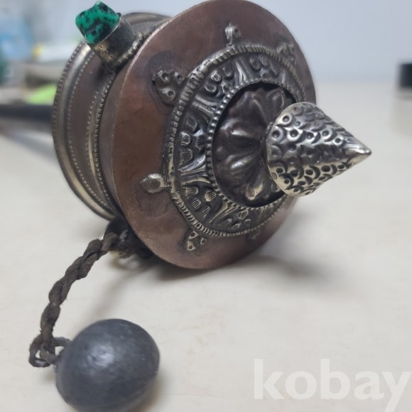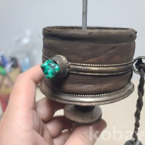 티벳에서 건너온 옴마니 반메흠 기물입니다 내부에는 불경이 다발로 가죽케이스에 담겨있습니다 한바퀴 돌리면 불경을 한번 읽는다고 합니다 장식과 상태 모두 좋습니다