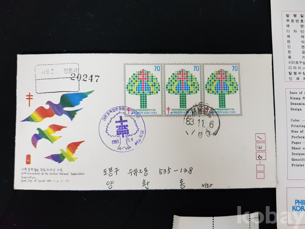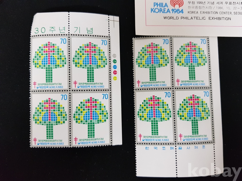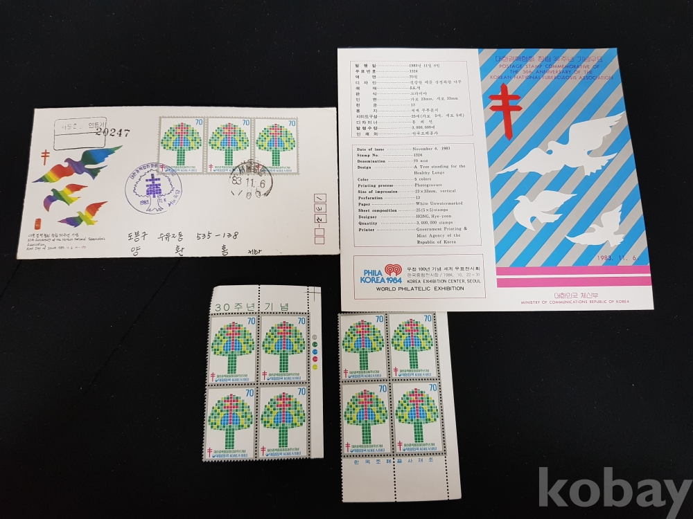 - 1983년 대한결핵협회 창립 30주년 기념 안내카드, 초일봉피, 명판 등 모음
