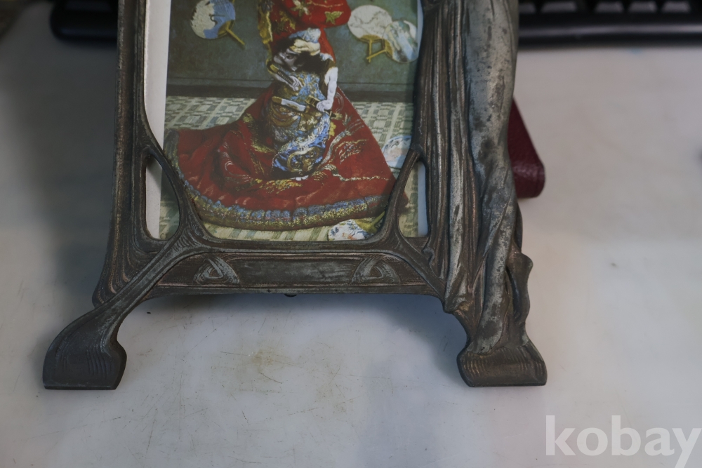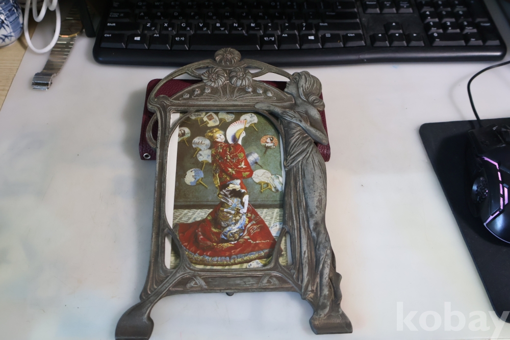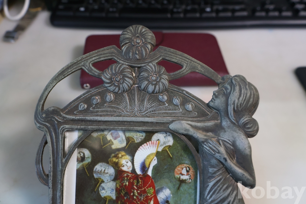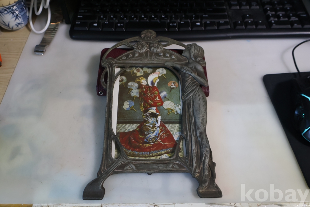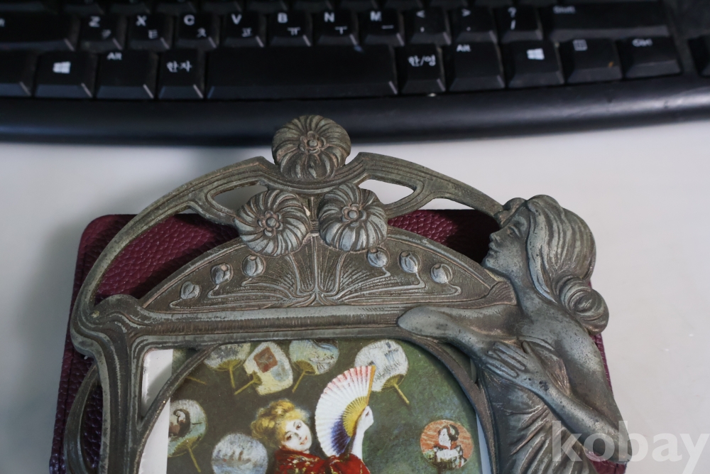 아름다운 금속 공에품 액자 임니다 아름다운 여인의 멋진 자태를 가진 1920 30대의 아트누보 이며 세월의 고태미를 가진 명품 임니다 .단단 한 금속 이며 지남 철이 붙지 않는 명물 임니다 유럽 프랑스 임니다 세월의 흔적이 보이는 극히 귀한 명품 임니다