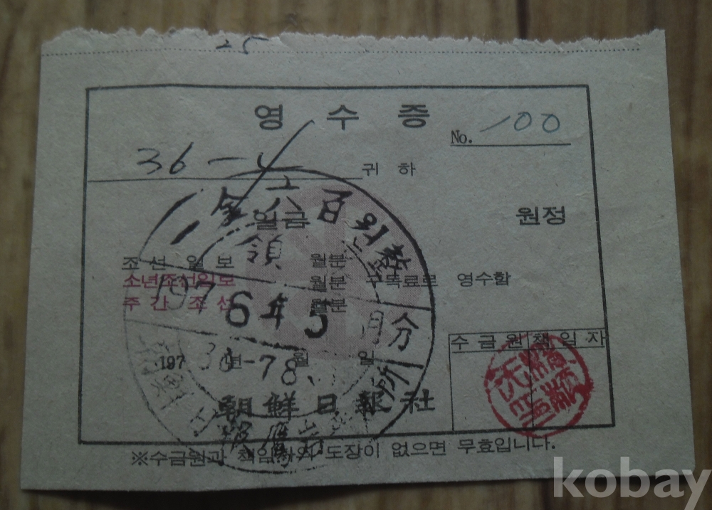 1976년 600원 시기 조선일보 구독료영수증