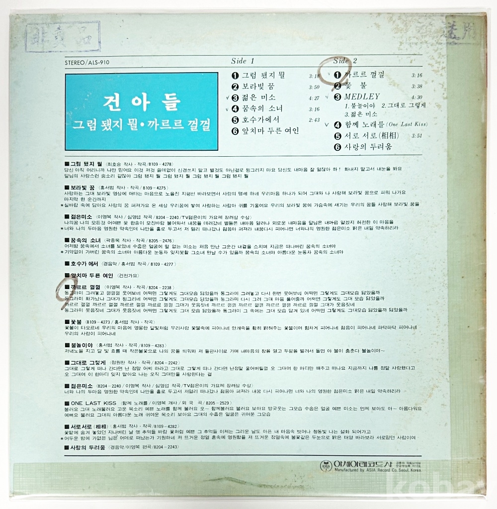 상품 설명 | Side A 1. 그럼 됐지 뭘 2. 보라빛 꿈 3. 젊은 미소 4. 꿈속의 소녀 5. 호수가에서 6. 앞치마 두른 여인 Side B 1. 까르르 껄껄 2. 꽃불 3. MEDLEY 4. 함께 노래를 5. 서로 서로 6. 사랑의 두려움 | ||