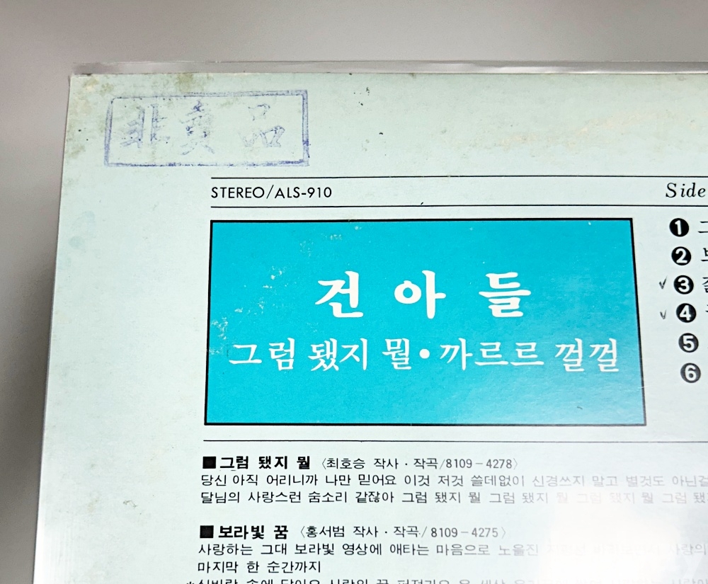 자켓 상태 | 테이프 수리, 자켓 비닐커버 씌워져 있음 | 음반 상태 | A, B면 잔스크레치 |