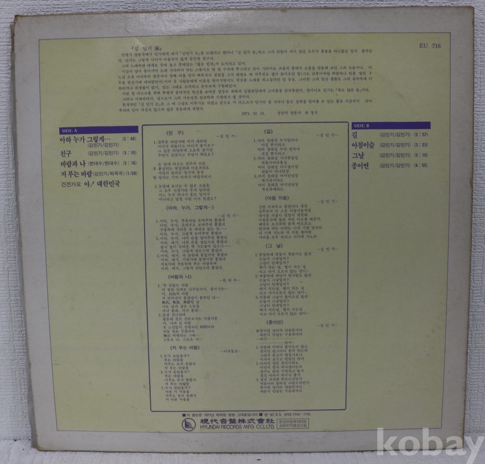 | 자켓상태 | EX : 약간의 마모, 모서리 찢김 존재 | 음반상태 | EX : 재생에 영향 없는 가벼운 기스 존재 | 발매정보 | 초반 | 가사지여부 | 유 |