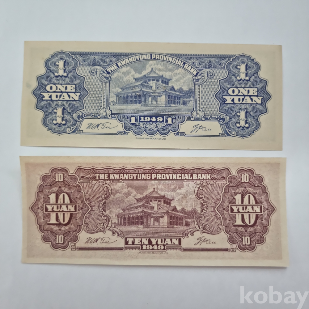 1949년 발행된 중국 1위안, 10위안 미사용 지폐 총 2매입니다.