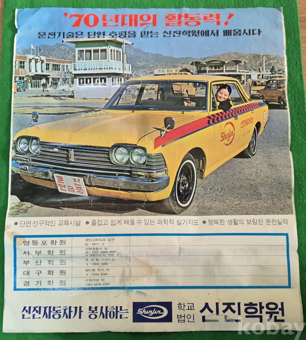 5]. 참고 : 경인고속도로 입구의 영등포학원, 서울 서부경찰서 앞의 서부학원, 부산 주례동의 부산학원, 대구 평리동 지서 뒤의 대구학원, 수원극장 뒤 경기학원의 광고가 수록되어있는 신진자동차가 봉사하는 학교법인 신진학원의 운전면허 포스터