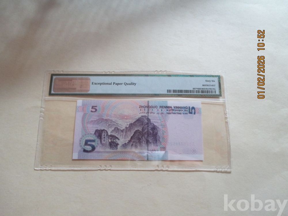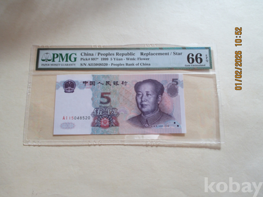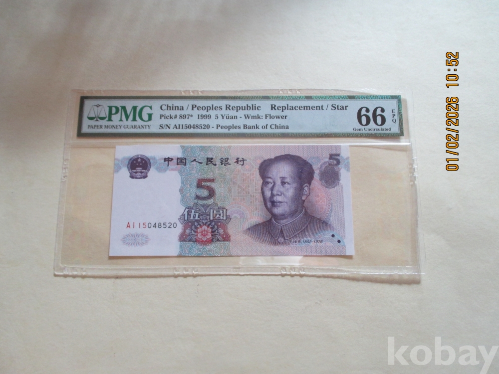중국1999년 5위안 보충권 PMG 66등급 미사용