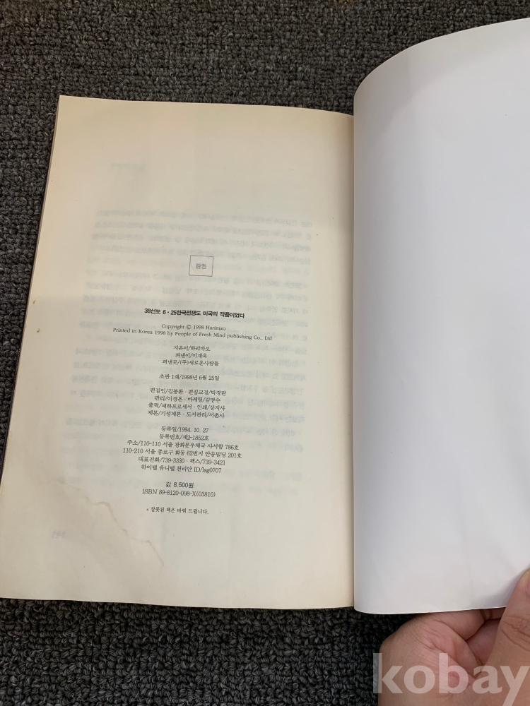 [희귀본, 한국현대사, 분단, 6.25전쟁] 하리마오, <38선도 6.25 한국전쟁도 미국의 작품이었다>, 새로운 사람들, 1998, p. 295, 상태 하급(하단 젖은 흔적 , 사진참조)