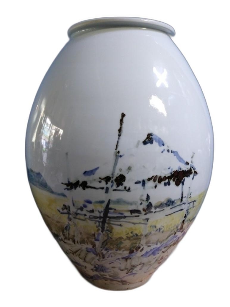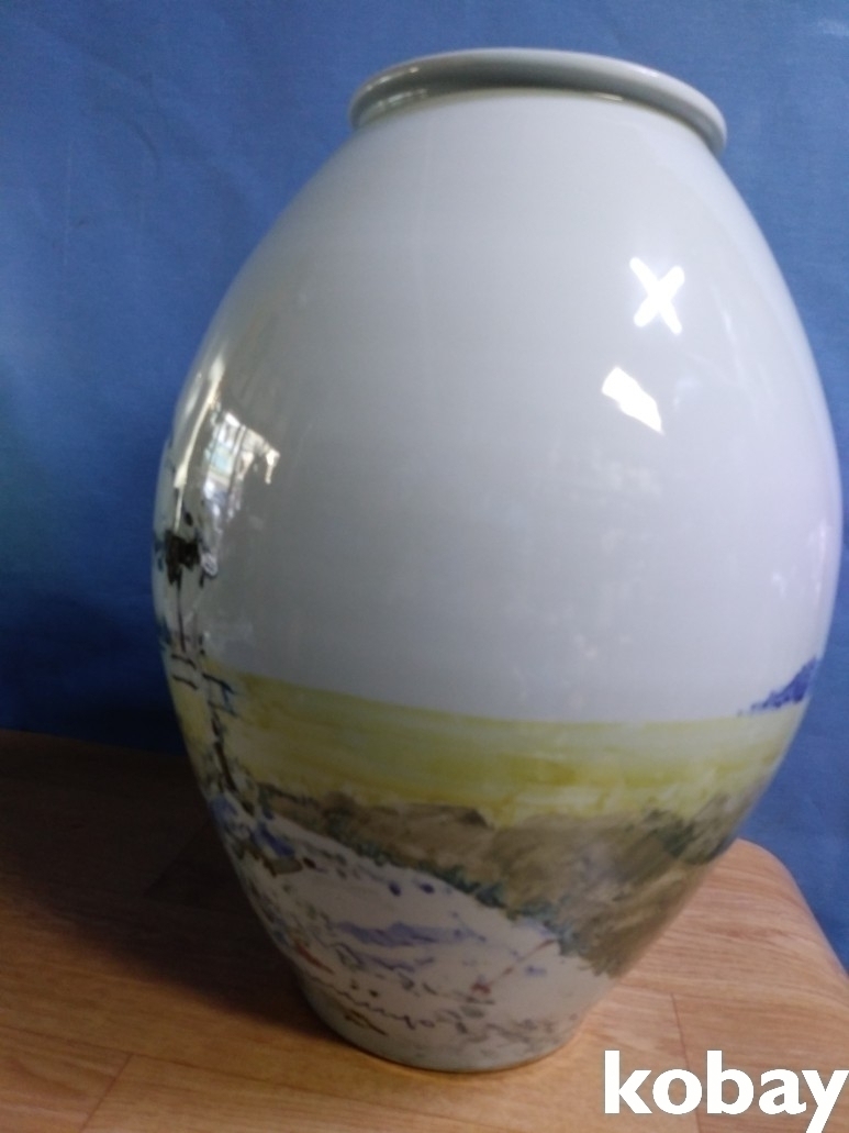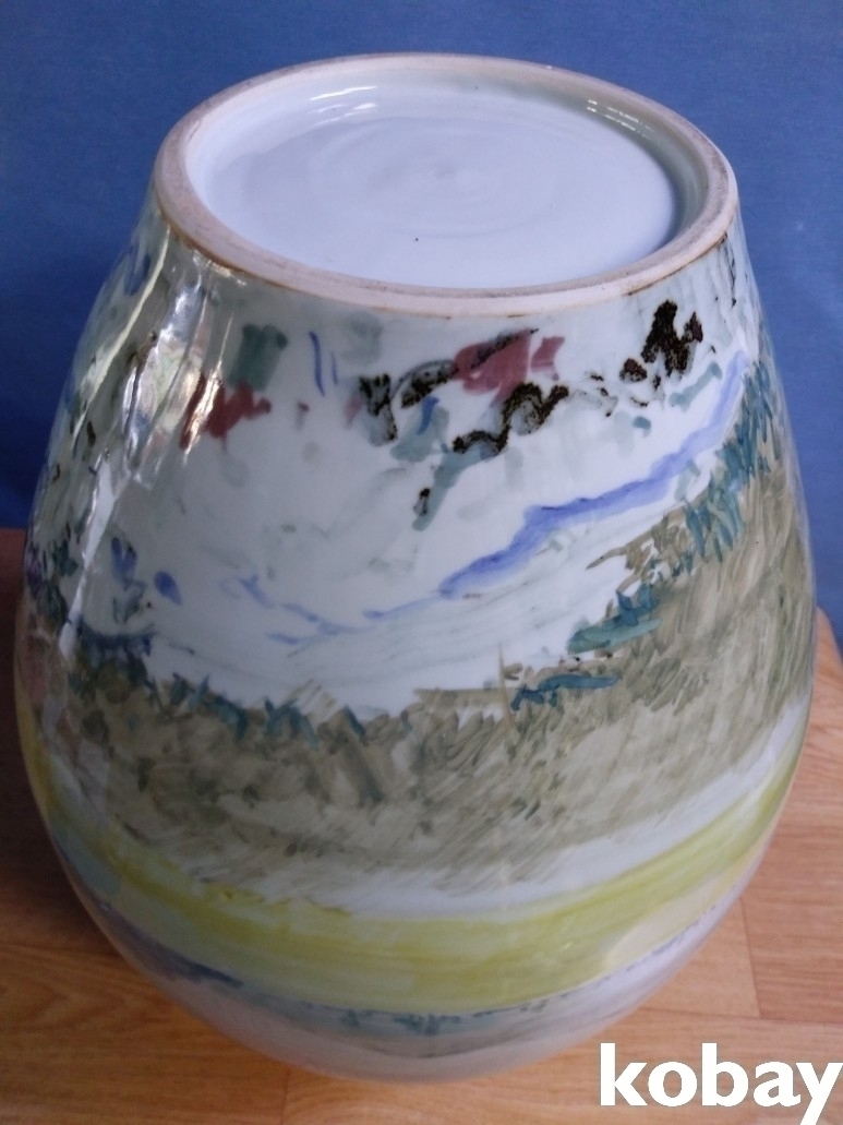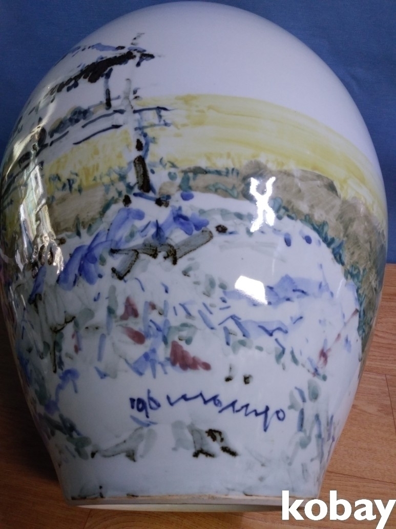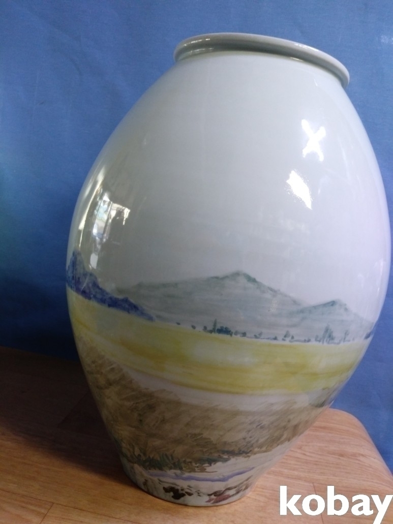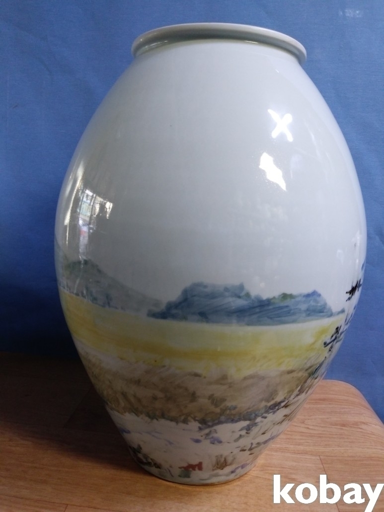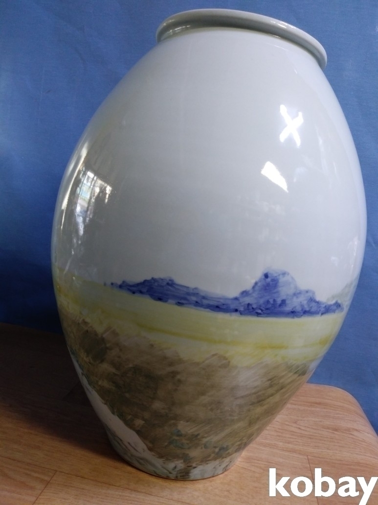 오두막 풍경을 아름답게 표현한 고구마형 도자기 입니다.
