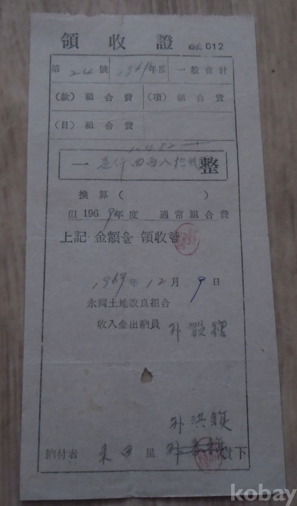 1969년 영동토지개량조합 발행 영수증