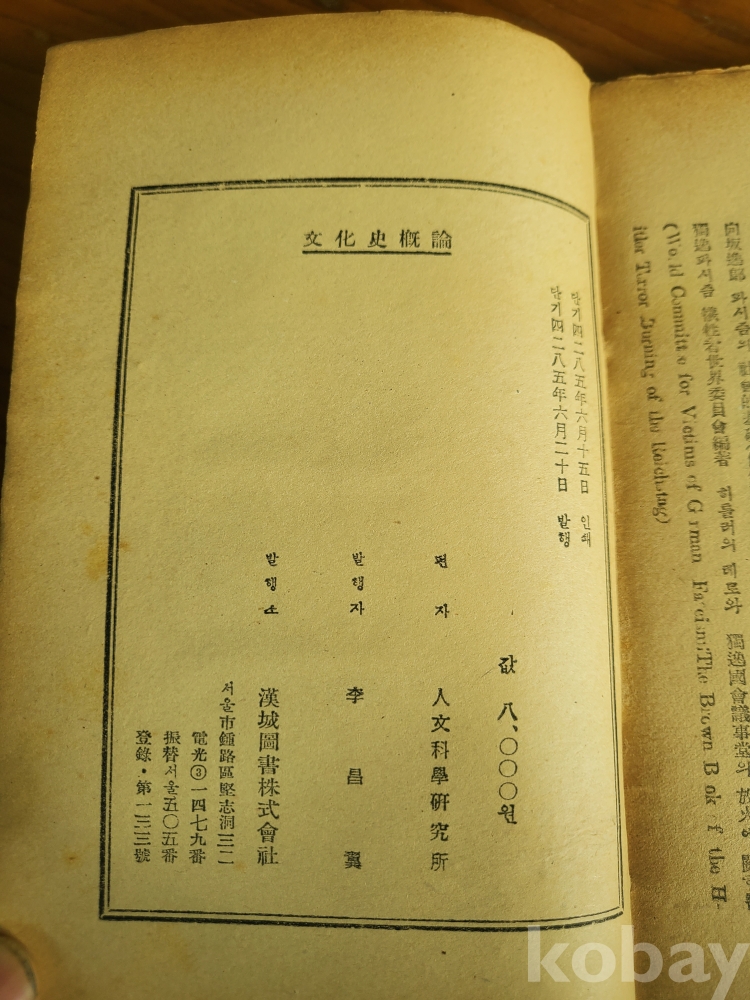 1. 문화사개론, 인문과학연구소 편, 한성도서주식회사, 1952년, 213쪽, 상태 상, 사진 참조