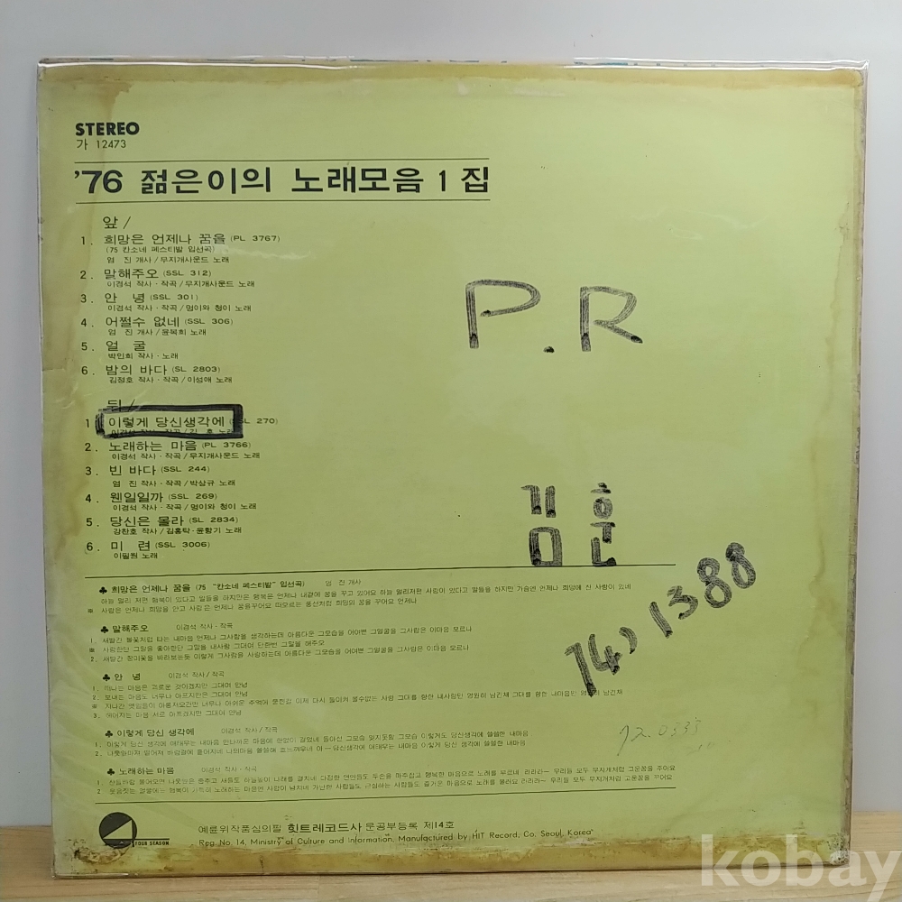 | 자켓상태 | VG : 주름, 접힘, 모서리 찢김 다수 | 음반상태 | EX : 재생에 영향 없는 가벼운 기스 존재 | 발매정보 | 초반 | 가사지여부 | 무 |