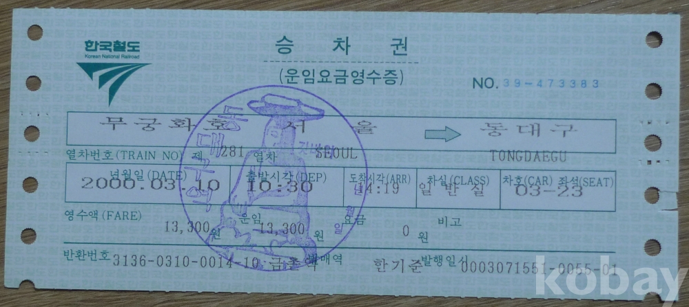 2000년 동대구역 기념 일부인 서울 - 동대구 무궁화호 승차권