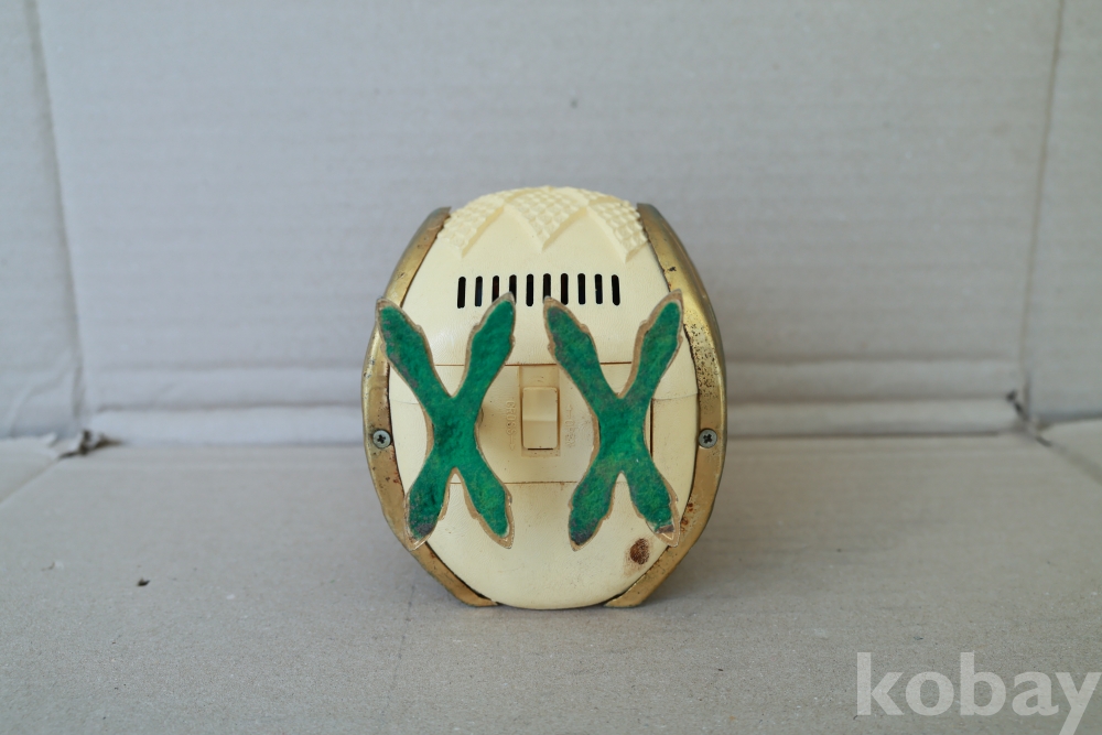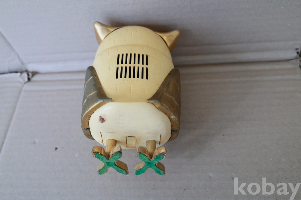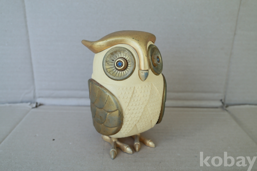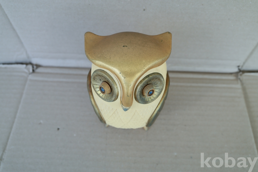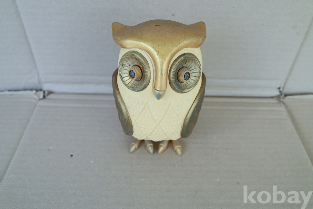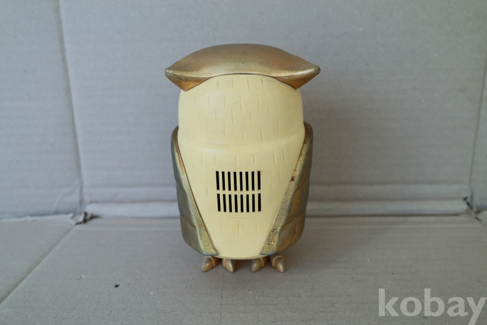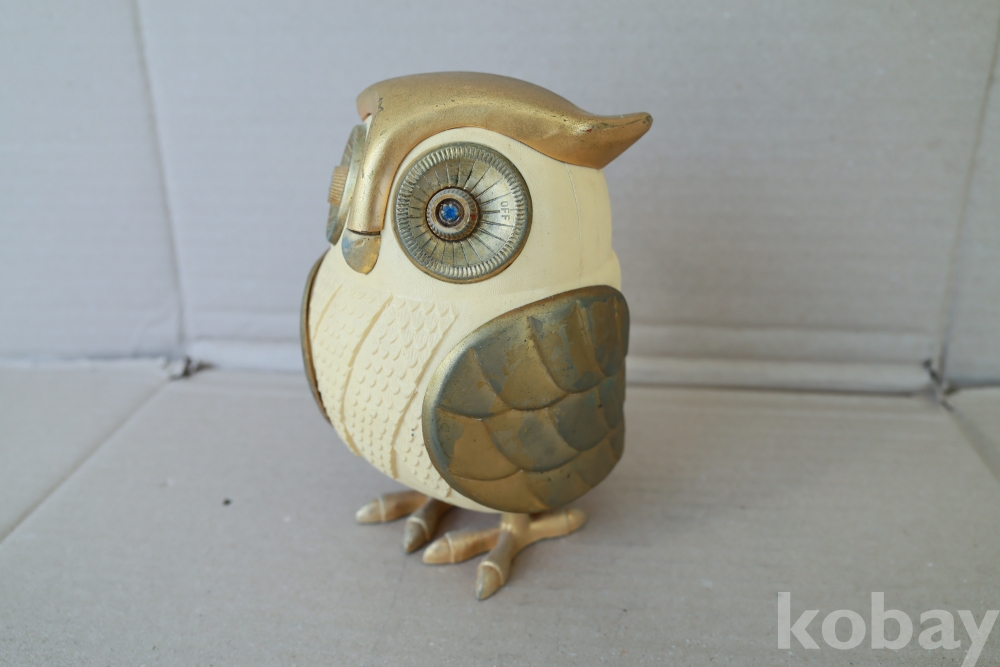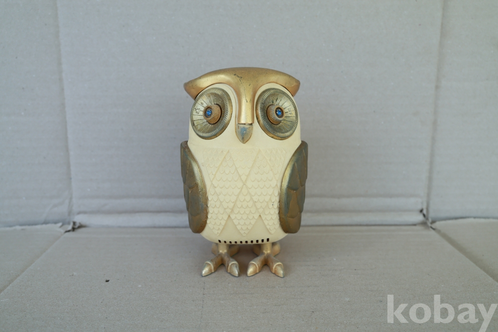 - 1960년대 일본에서 제작된 전설적인 노벨티 라디오로, 올빼미의 두 눈이 각각 전원/볼륨 및 주파수 튜닝 노브 역할을 하는 기발한 디자인이 특징입니다. 영화 '타이탄족의 멸망'에 등장하는 기계 부엉이 캐릭터를 연상시키는 독특한 외형 덕분에 전 세계 빈티지 컬렉터들이 가장 선호하는 아이템 중 하나이며, 황금빛 디테일과 보석 같은 눈 장식이 돋보이는 명작입니다.