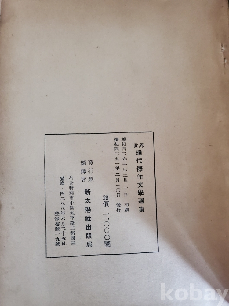 1. 세계현대문학걸작선집, 신태양사출판국, 1958년, 270 쪽, 상태 상, 사진 참조