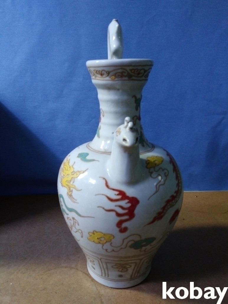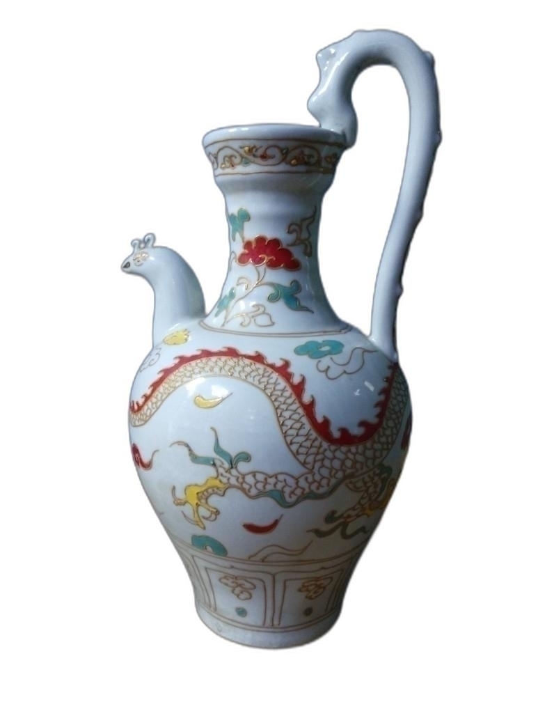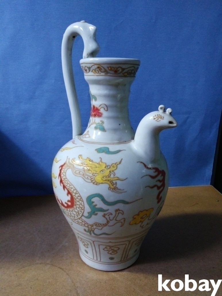 용 문양에 용 손잡이가 있는 주전자 도자기 입니다.