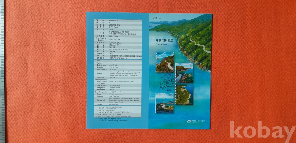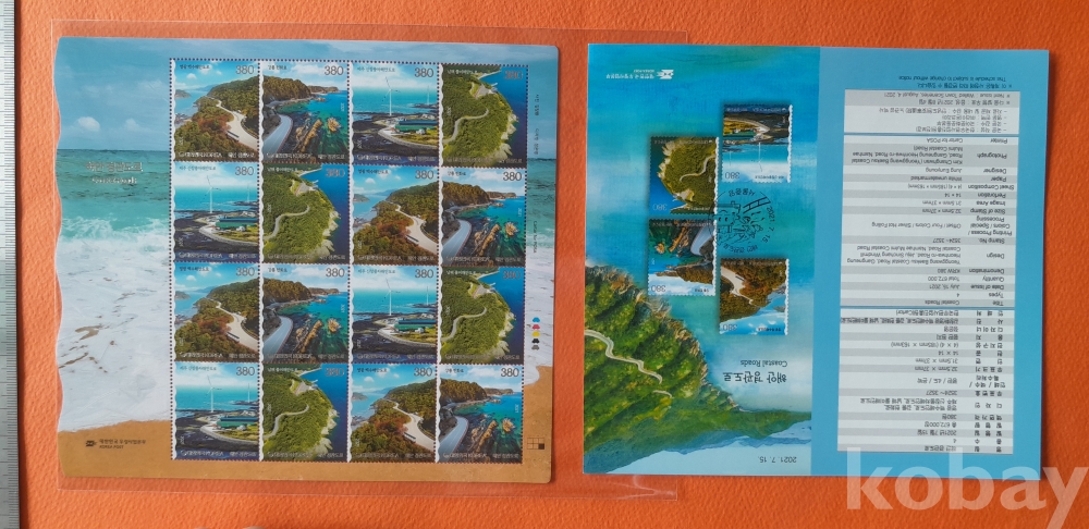 2021년 380원 해안 경관도로 16매 전지(안내카드 포함) 입니다.