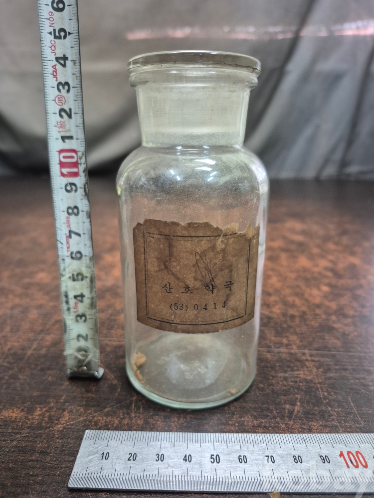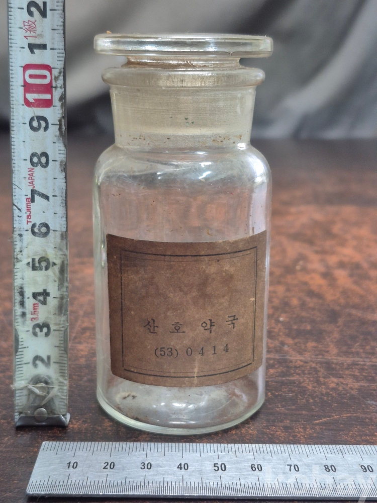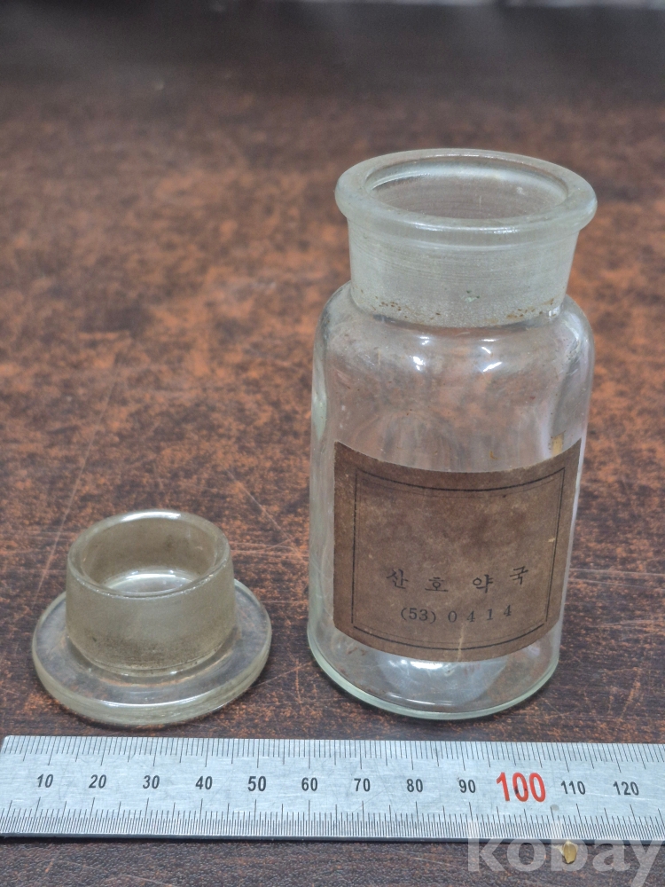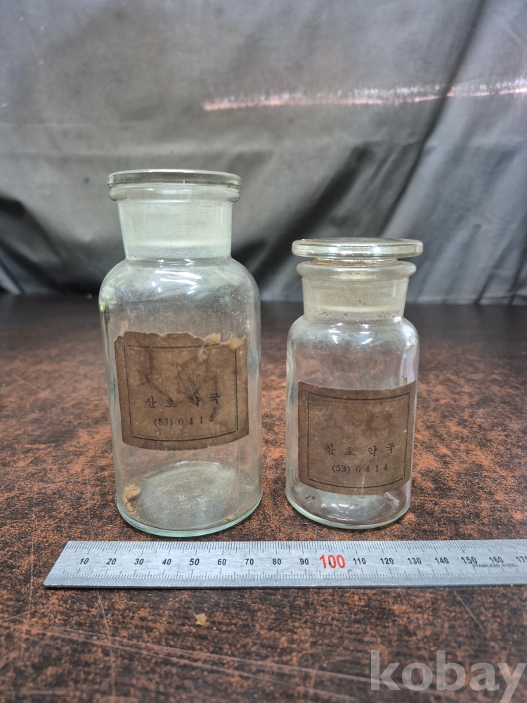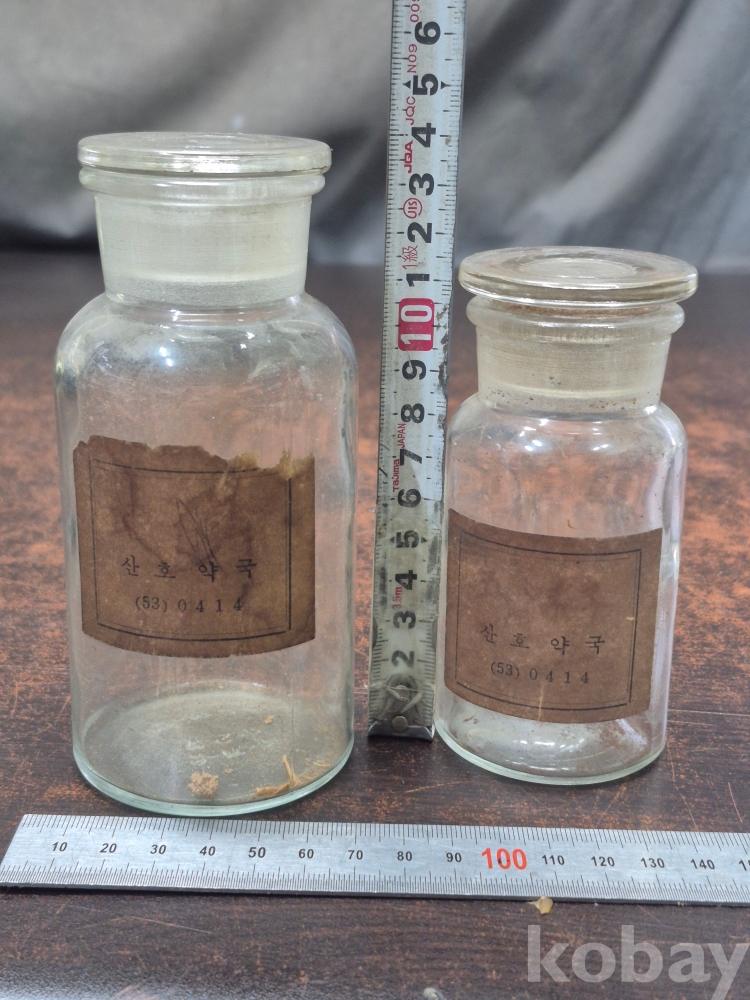 1950-60년대 실사용하던 불어병으로 만든 약국에서 사용하던 약품저장용 시약병 산호약국 53) 0414 메이드 인 USA 2점 일괄 6.5*6.5*14