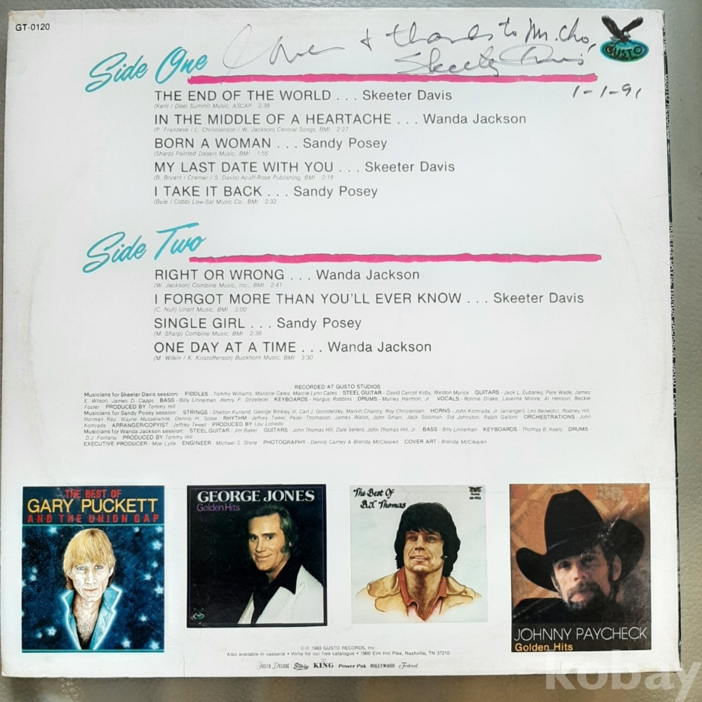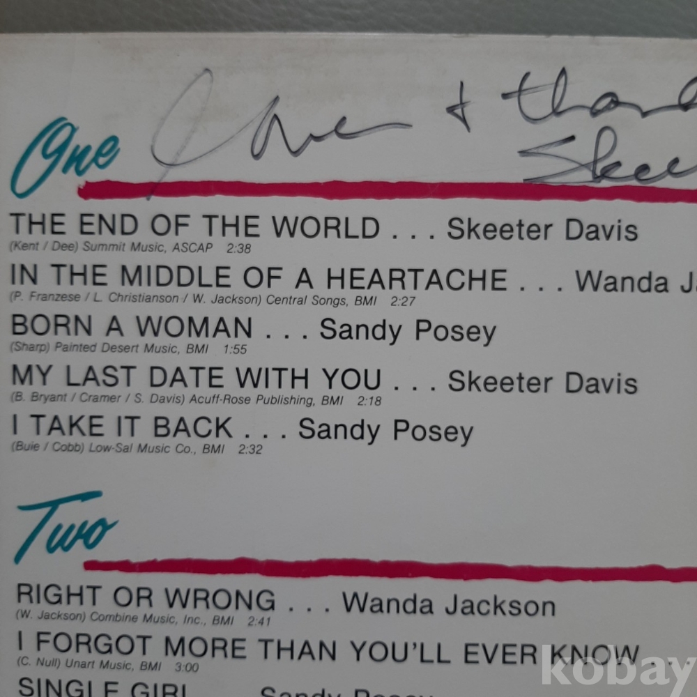 Skeeter Davis 의 싸인이 들어있는 음반 입니다. The End Of The World가 수록되어 있습니다. Sandy Posey 와 Wanda Jackson의 곡도 같이 수록되어 있습니다.