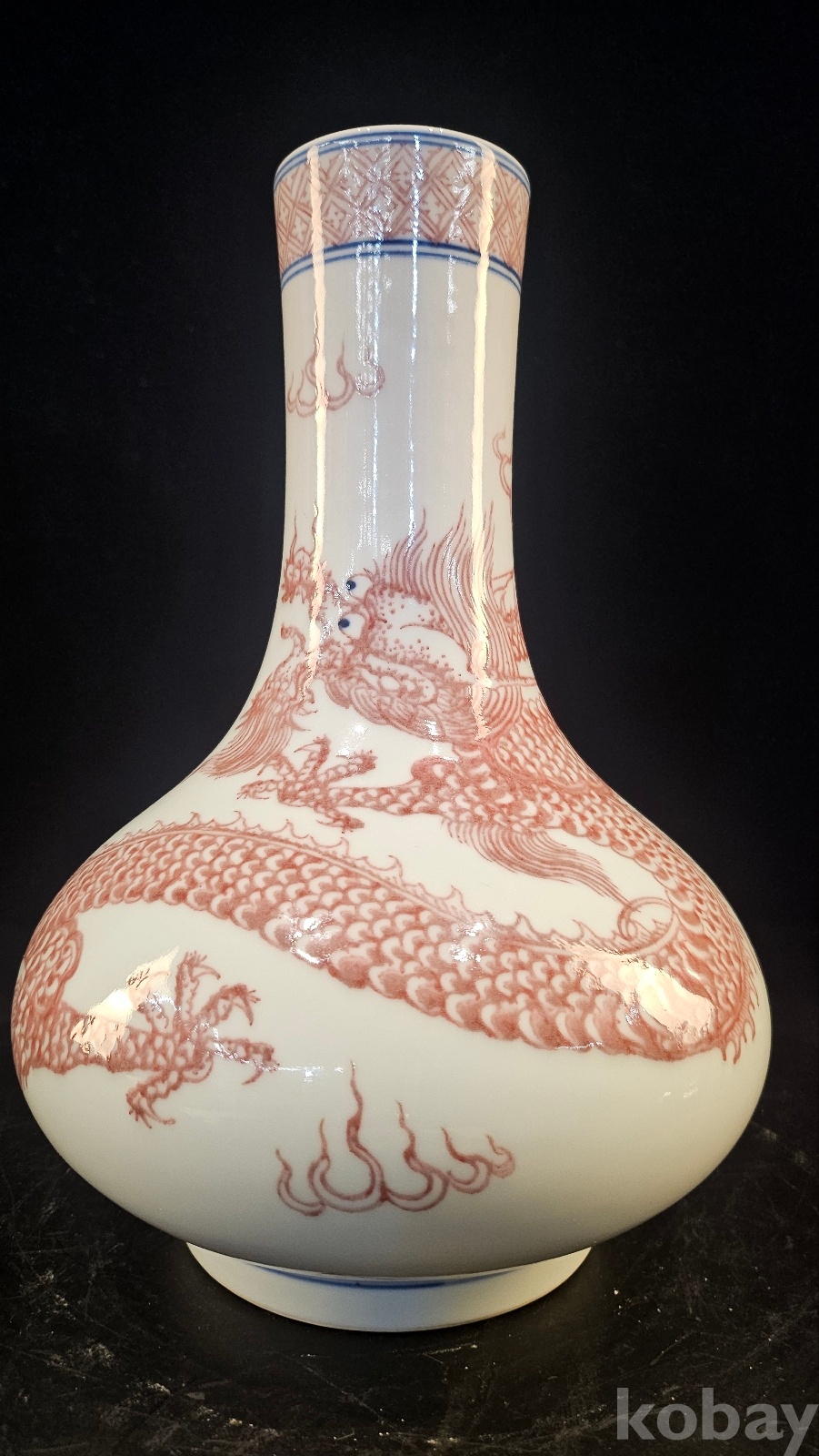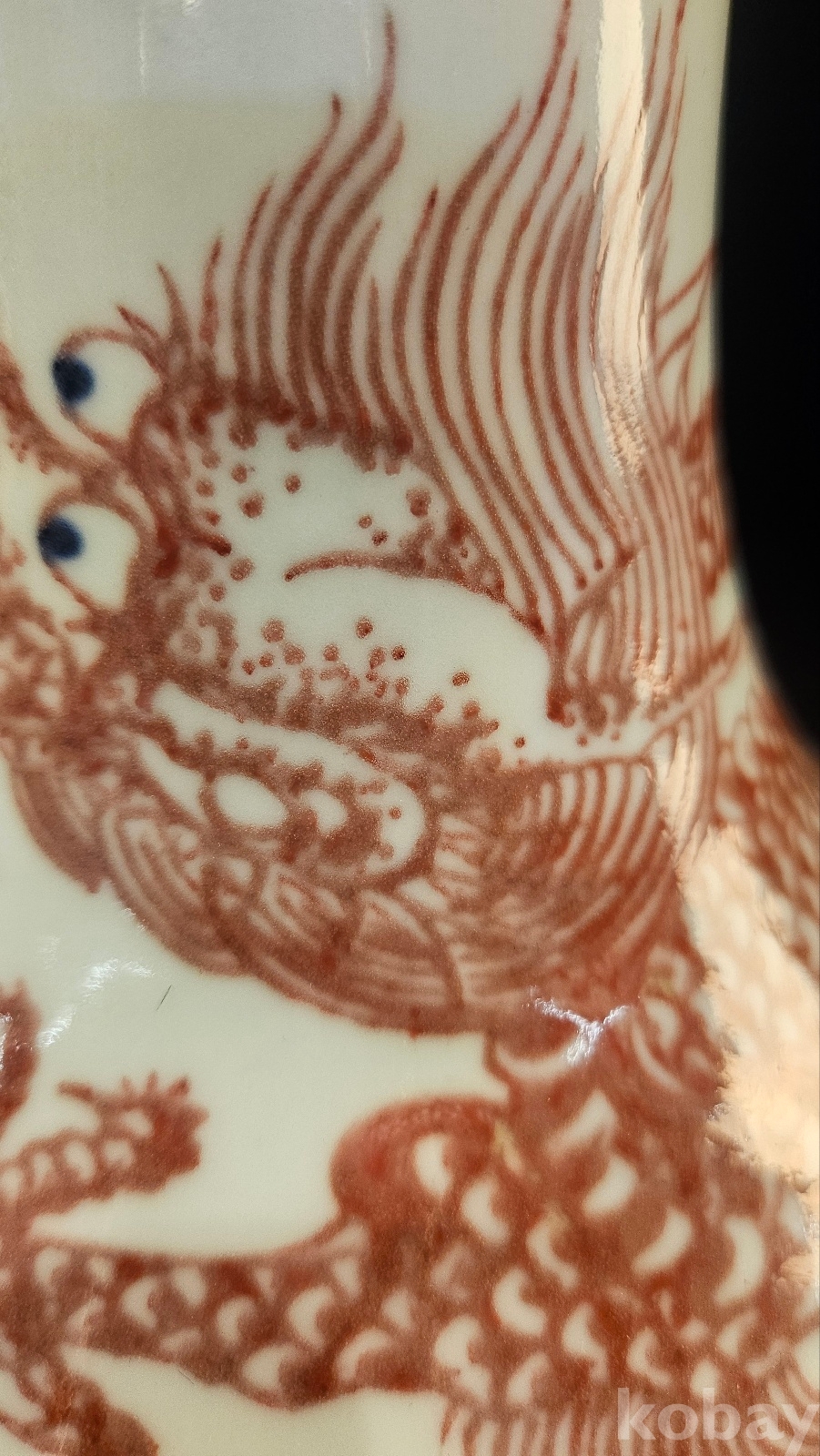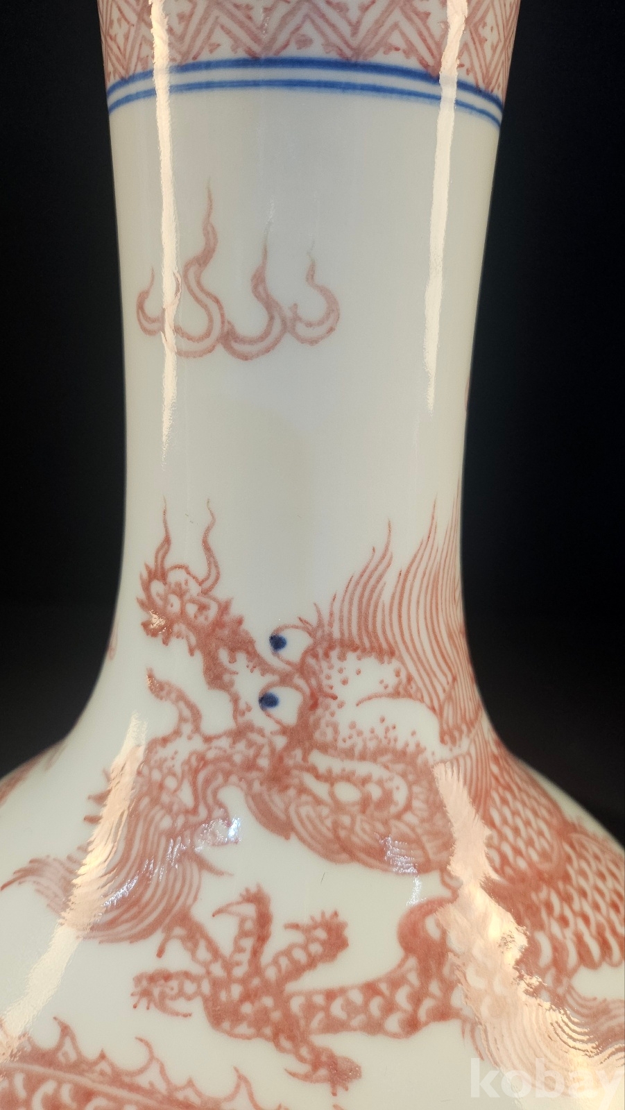 높이 26.5 청말 관요이다. 고방기물 옹정,건륭년간에 유행한 유리혼 운용문 기물이다 비늘과 발톱을 보면 궁중의례용임을 알수 있다 목 부분의 기하문으 청대 황실풍이다 용눈에 푸른점은 18~19세기 관요풍 채색의 특징을 보여주고 있다