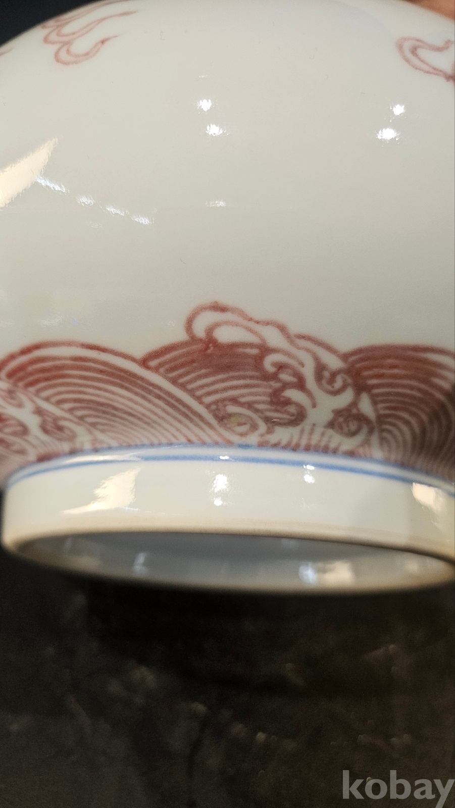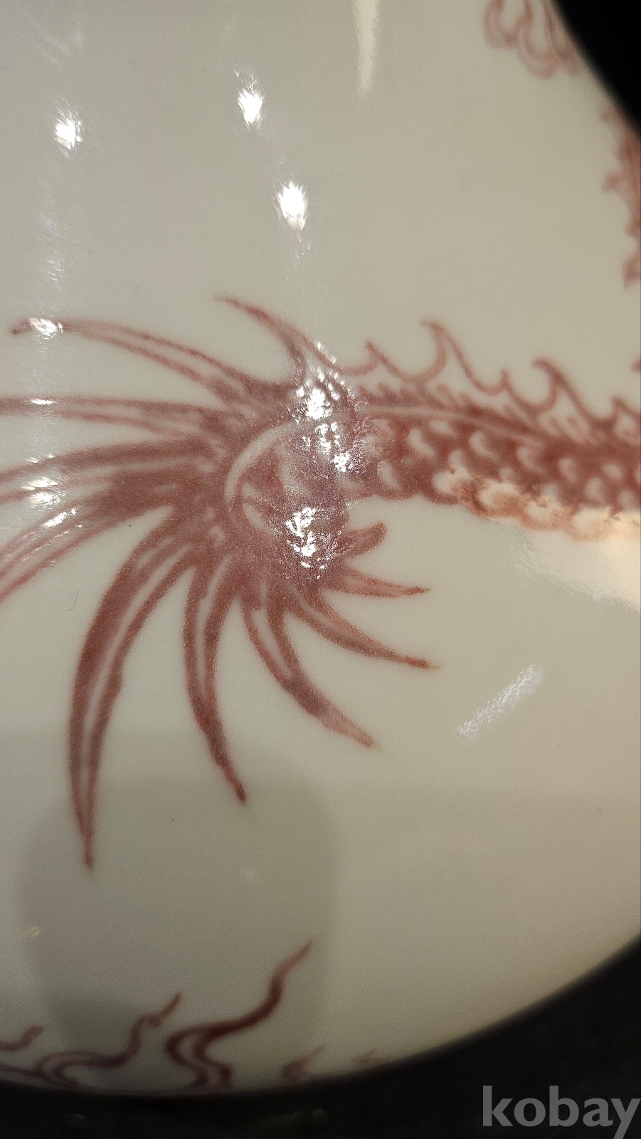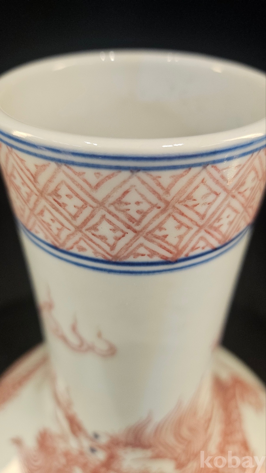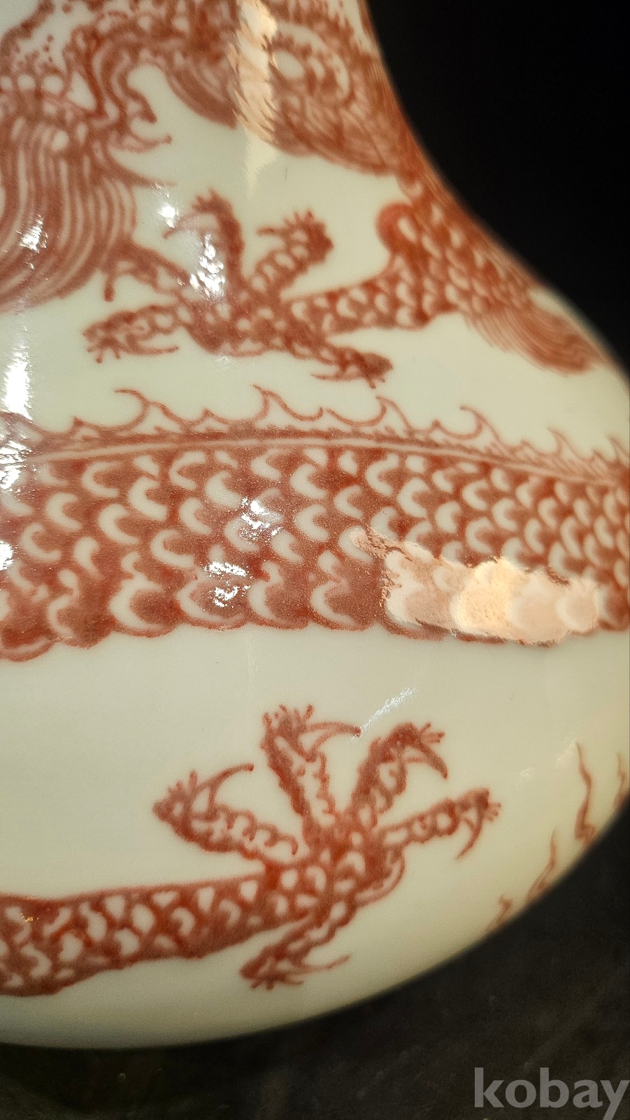 높이 26.5 청말 관요이다. 고방기물 옹정,건륭년간에 유행한 유리혼 운용문 기물이다 비늘과 발톱을 보면 궁중의례용임을 알수 있다 목 부분의 기하문으 청대 황실풍이다 용눈에 푸른점은 18~19세기 관요풍 채색의 특징을 보여주고 있다