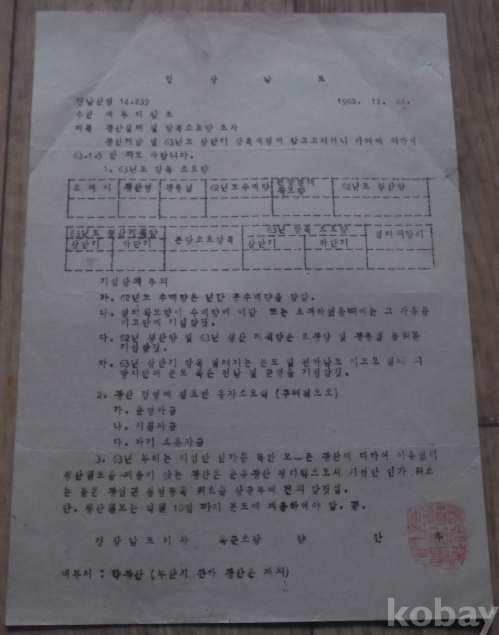 1962년 광산실태 및 항목소요량 조사(군정 경남도지사)