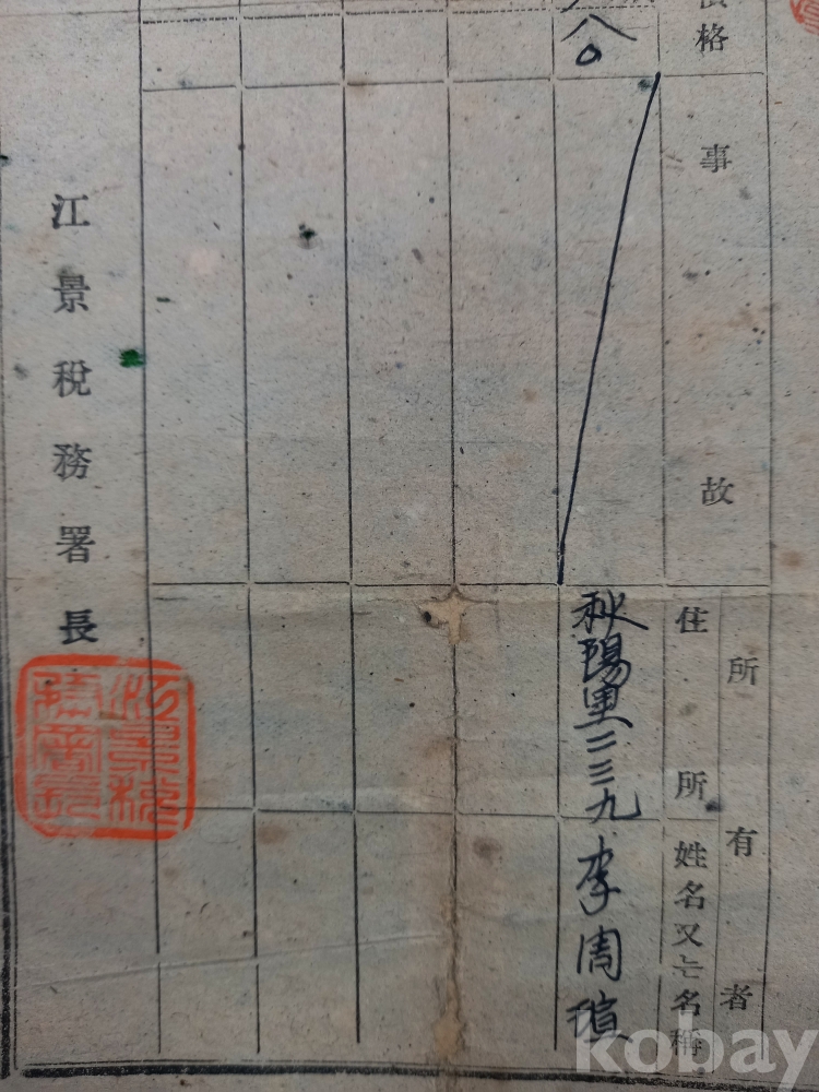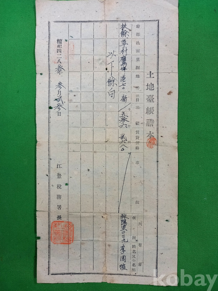 하단에 강경세무서장(江景稅務署長)의 직인과 명칭이 확인됩니다. 당시에는 세무서에서 토지대장 업무를 담당했음을 보여줍니다.
