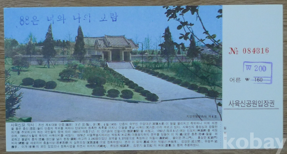서울 사육신 공원 어른 엽서 입장권