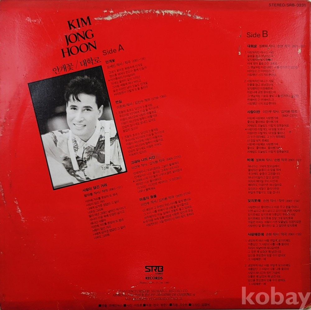 물 품 명 | 김종훈 / 안개꽃, 대학로 / 1989년 초반 / 서라벌레코드 |
