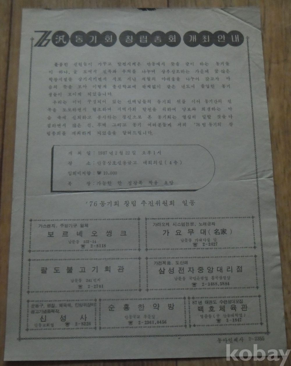 안동자료(전단지): 1987년 범 동기회 창립총회 개최안내