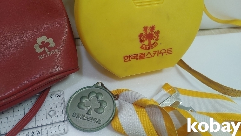 70~80년대 걸스카우트 용품 3종입니다 메달 가방 물통