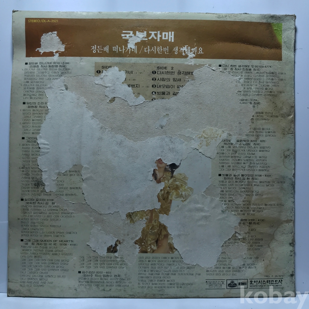 | 자켓상태 | G : 눈에 띄는 손상, 테이프, 필기 존재 | 음반상태 | EX : 재생에 영향 없는 가벼운 기스 존재 | 발매정보 | 알수없음 | 가사지여부 | 무 |