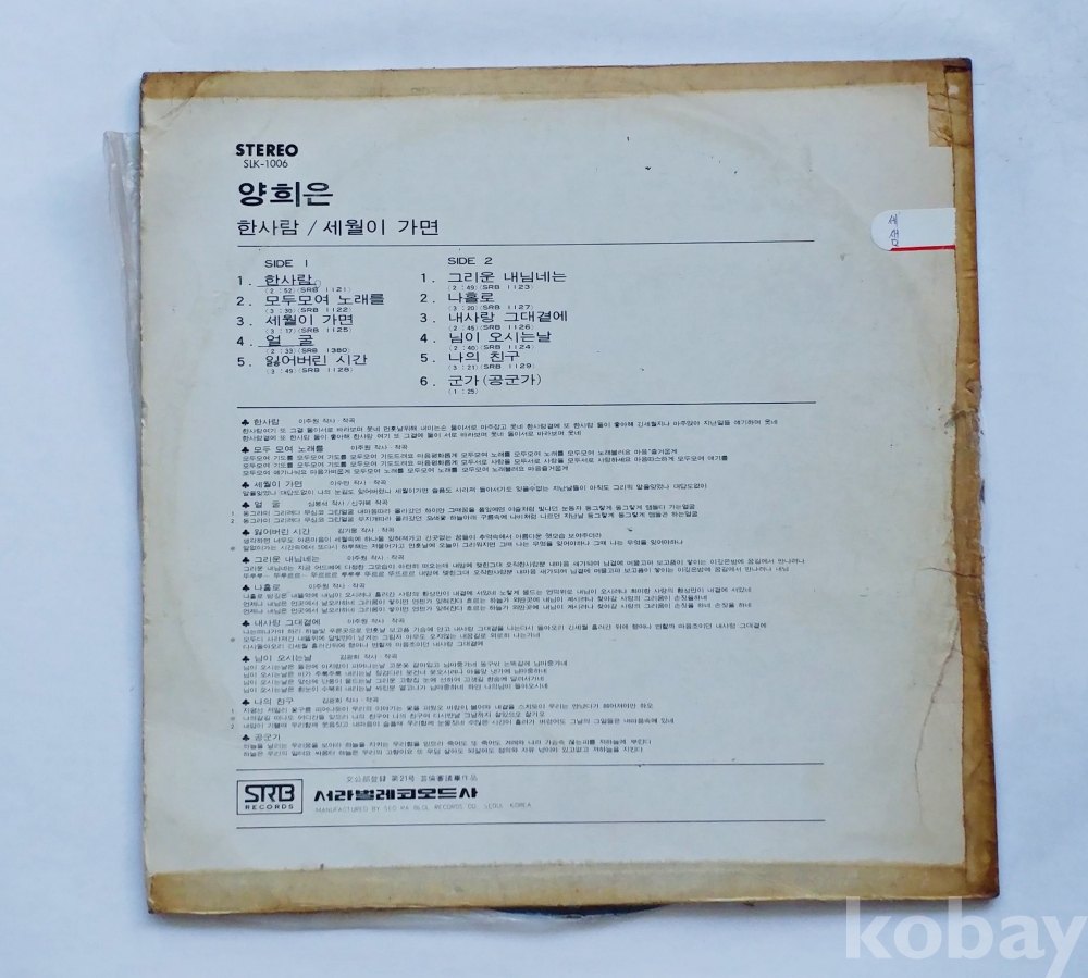 | 자켓상태 | EX : 약간의 마모, 모서리 찢김 존재 | 음반상태 | EX : 재생에 영향 없는 가벼운 기스 존재 | 발매정보 | 알수없음 | 가사지여부 | 무 |