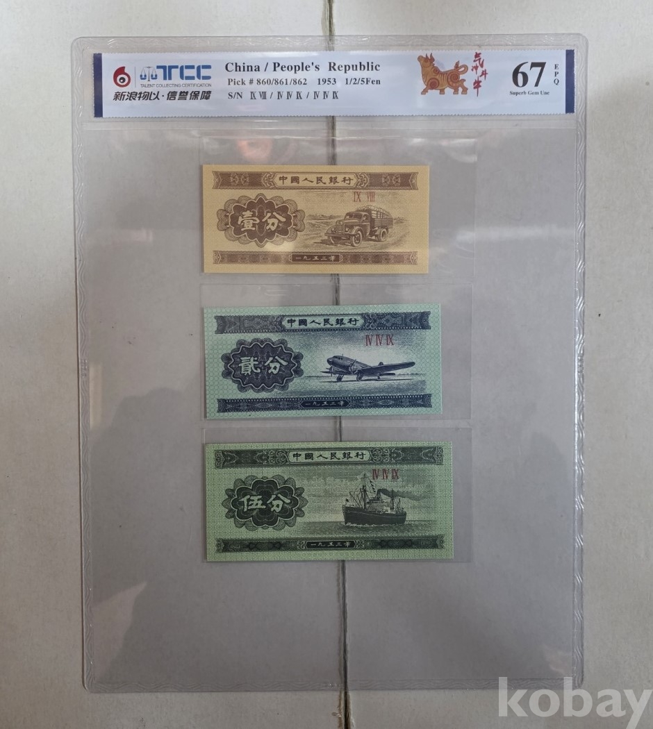 -1953년 중국 소액보조 분권 5, 2, 1분 3종 지폐 TCC67 고등급 입니다.