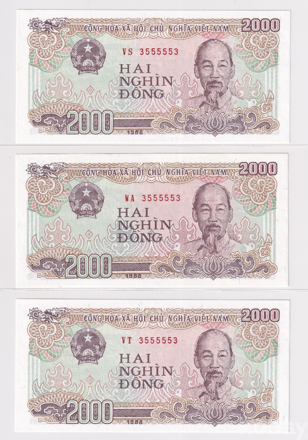 [베트남 지폐 특이번호 모음展] 1988년 2000동 3 55555 3 투 디지트 오봉 레이더 3쌍둥이