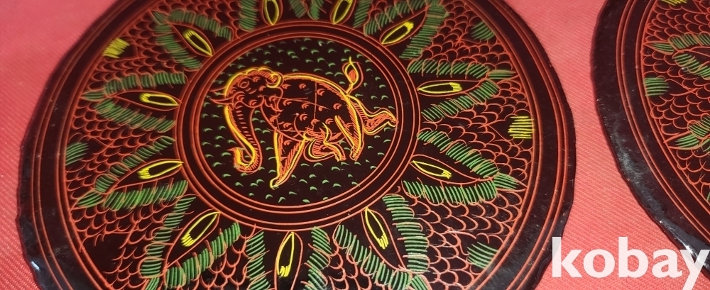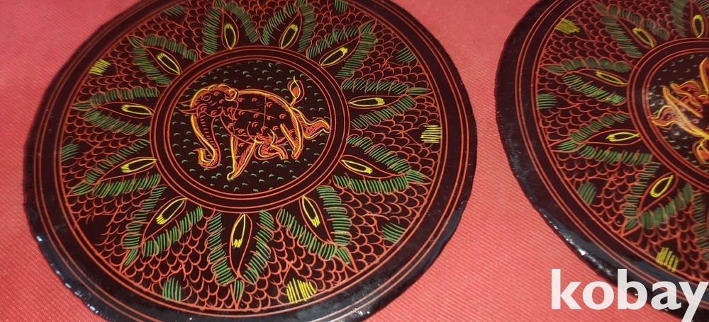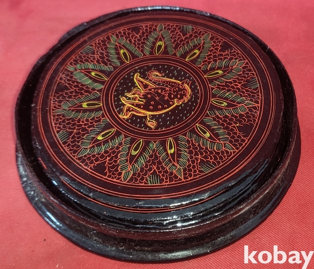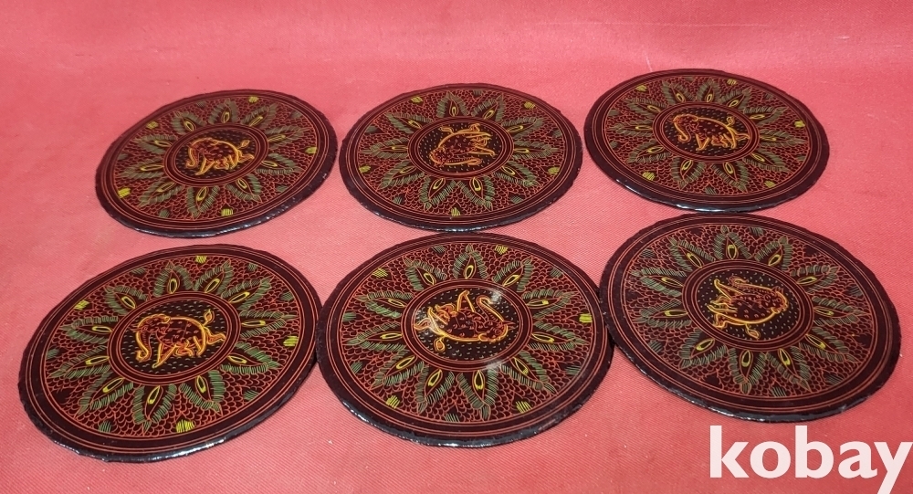 나무에 옻칠마감된 동물문양 찻잔 받침대 6 개 미사용 입니다,