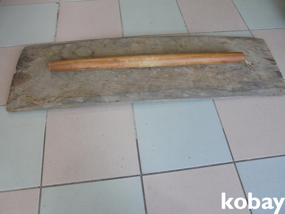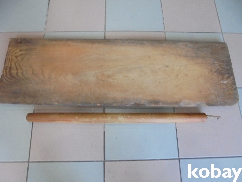 오래되여 때물이 짜글짜글하고 소나무내황으로 만들은 휘데없는중간자연튼데있는 추억의 국수안반과 홍두깨