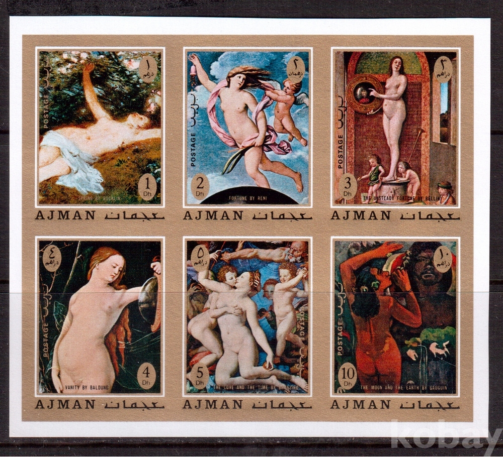 (누드명화) Ajman(아지만) 1971 아놀드 보클린의 <봄>외 (무공) sheet of 6 MNH