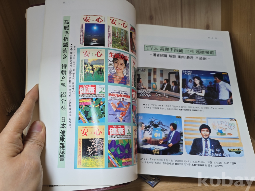 [설명] 고려수지침의 창시자인 유태우 회장이 직접 집필한 수지침의 바이블, <고려수지요법강좌> 제1권입니다. 손에서 인체의 장기와 상응하는 혈자리를 찾아 질병을 예방하고 치료하는 수지침의 기본 원리부터 상세한 요법들이 총망라되어 있는 묵직한 대형 전문 서적입니다. 특히 책의 앞부분에는 1980년대부터 90년대 초반까지 수지침이 국내외 언론(KBS, MBC 등)과 세계 각국에 소개되며 폭발적인 인기를 끌었던 당시의 생생한 흑백/컬러 화보들이 수록되어 있어 한의학 역사 자료로서의 소장 가치도 매우 높습니다. 한의학이나 대체의학을 공부하시는 분들, 혹은 묵직한 옛 전문 서적을 수집하시는 분들의 서재에 꽂아두기 아주 좋은 기물입니다.