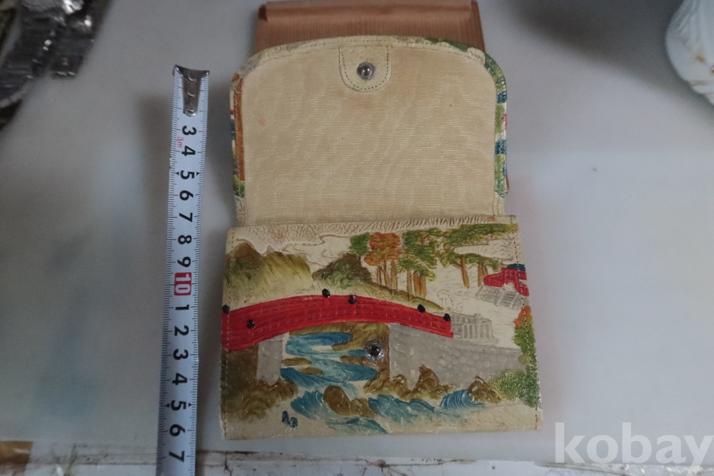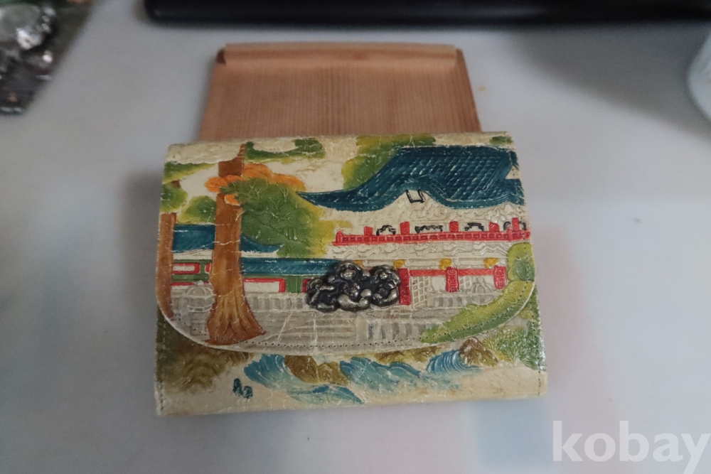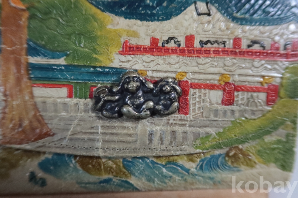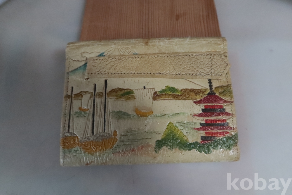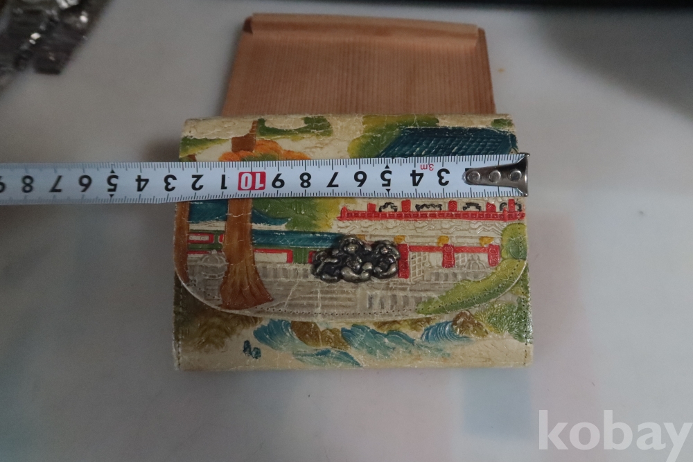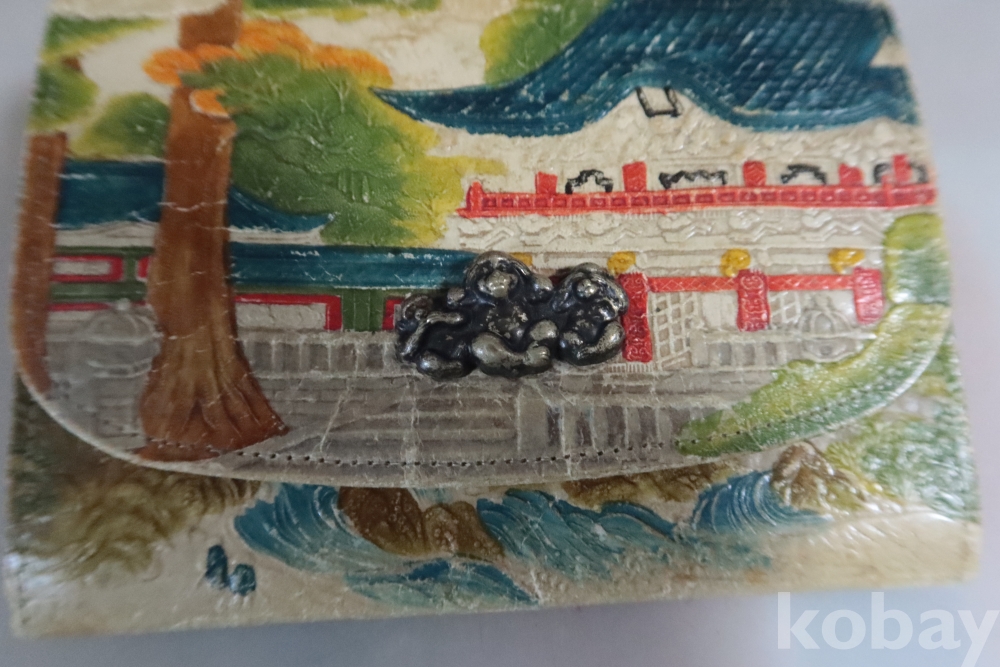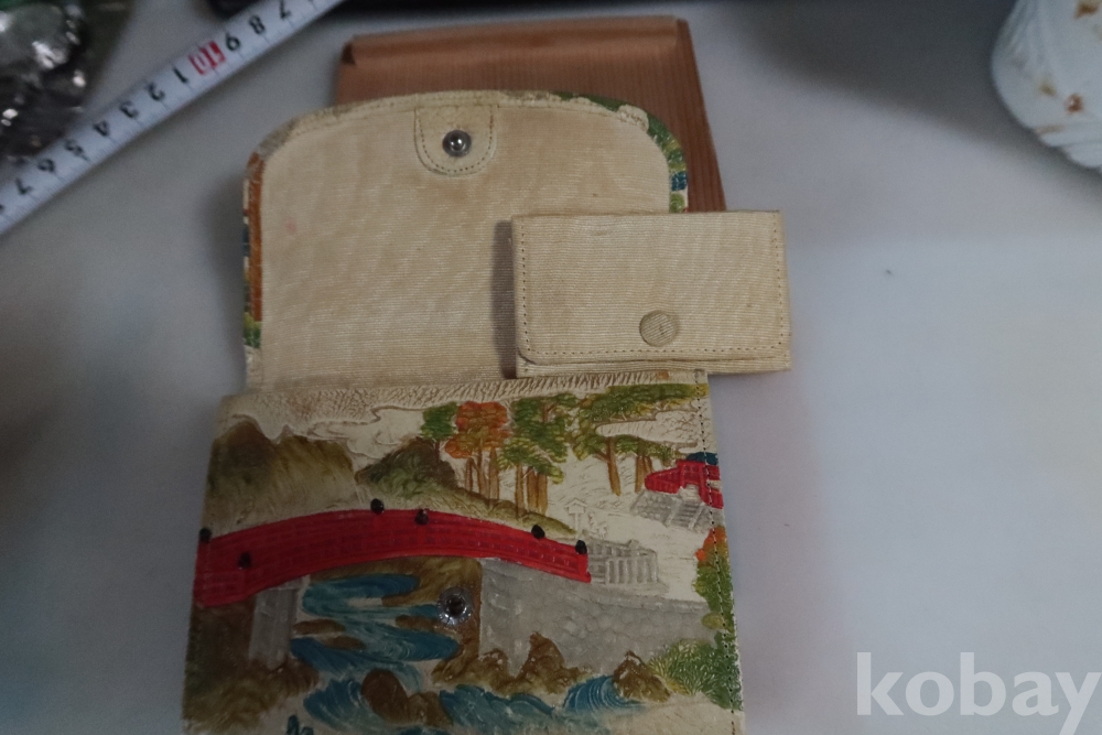 앙증맞은 원숭이 세마리 임니다 유명한 일본 원숭이를 주제로한 지갑 이며 안쪽으로 작은 지갑도 보임니다 배경도 멋진 그림이 보임니다 세월감을 가진 귀한 지갑 임니다