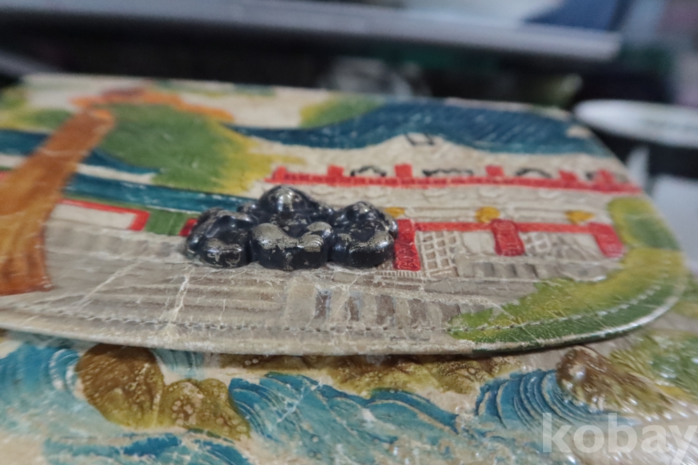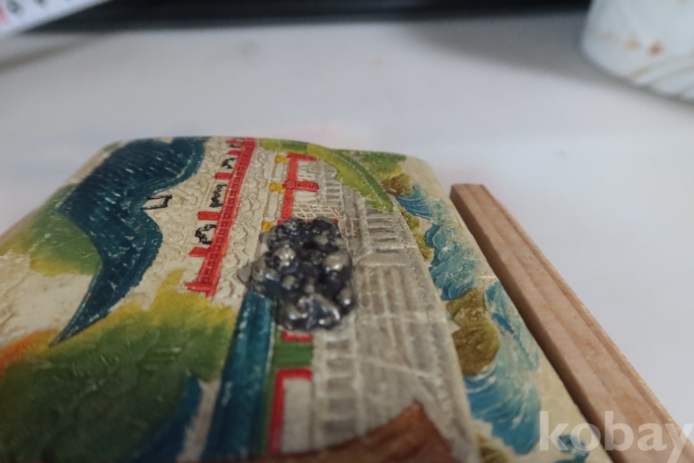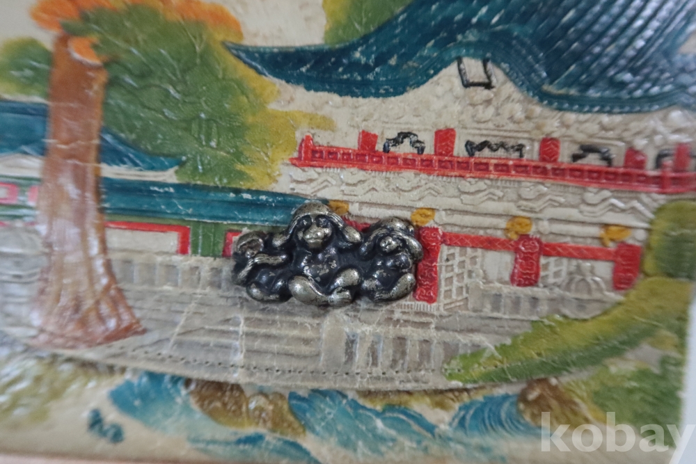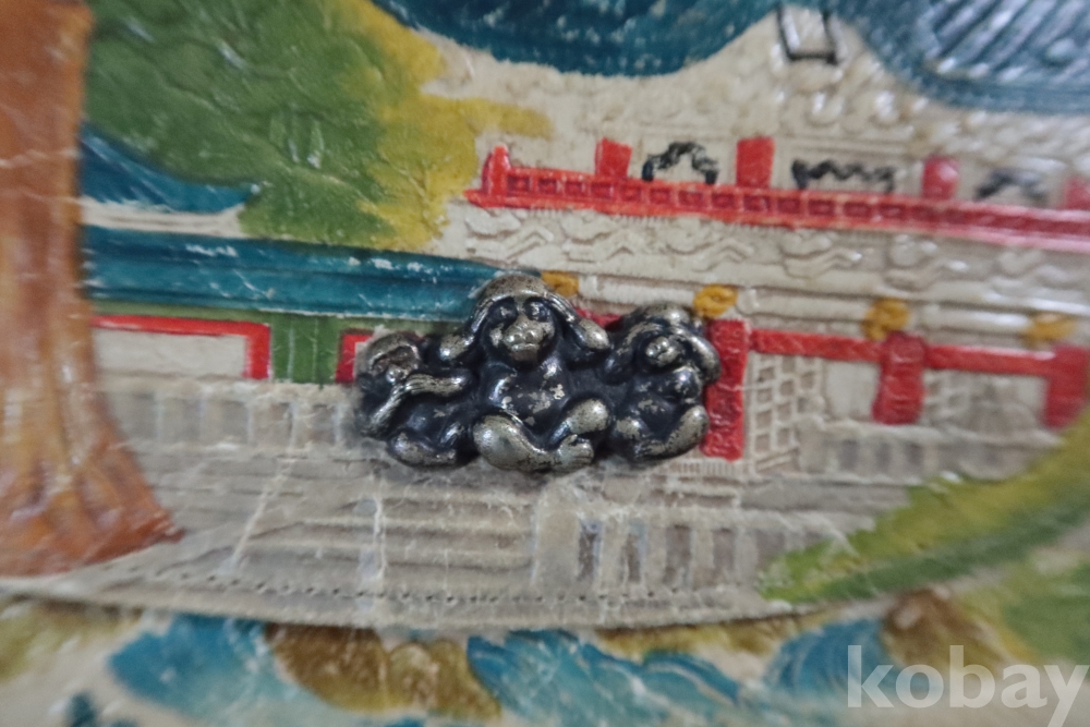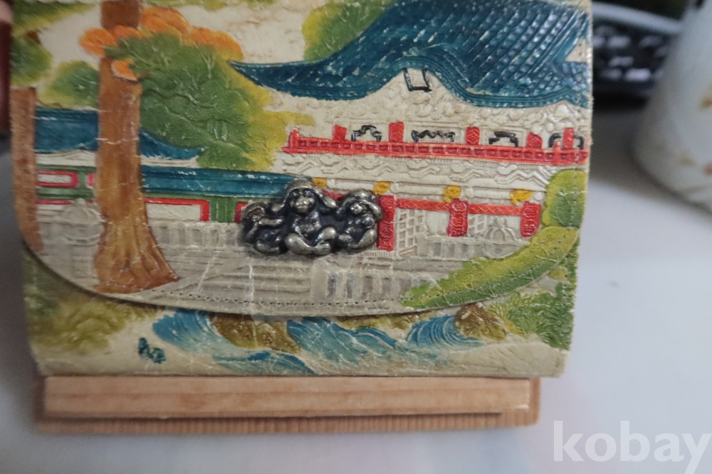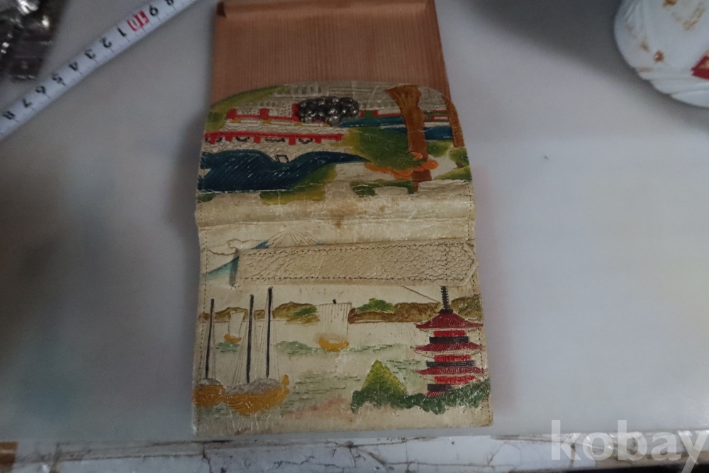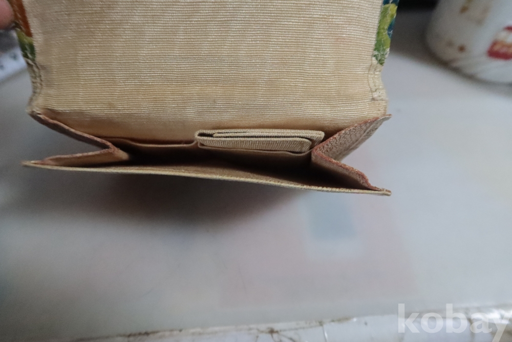앙증맞은 원숭이 세마리 임니다 유명한 일본 원숭이를 주제로한 지갑 이며 안쪽으로 작은 지갑도 보임니다 배경도 멋진 그림이 보임니다 세월감을 가진 귀한 지갑 임니다