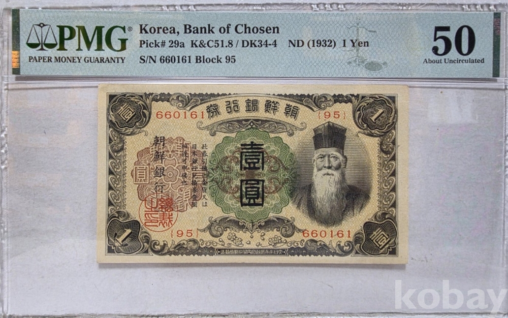 -대한민국 조선은행권 개 1원 유번호 PCGS 50 등급 입니다.