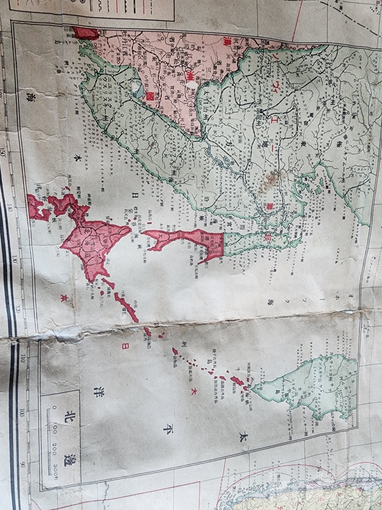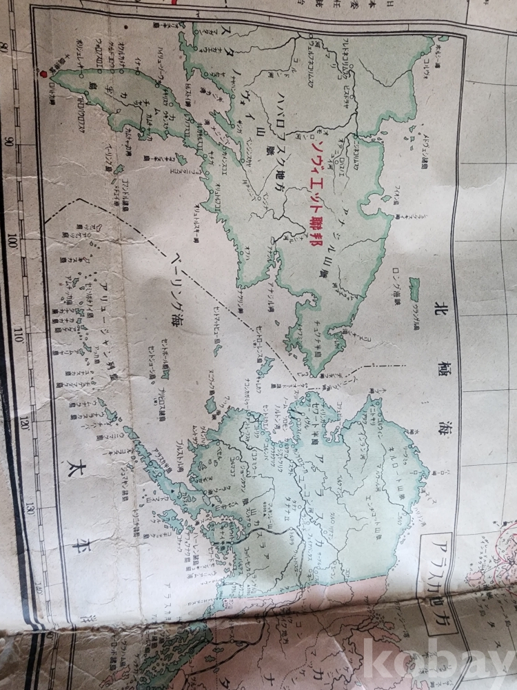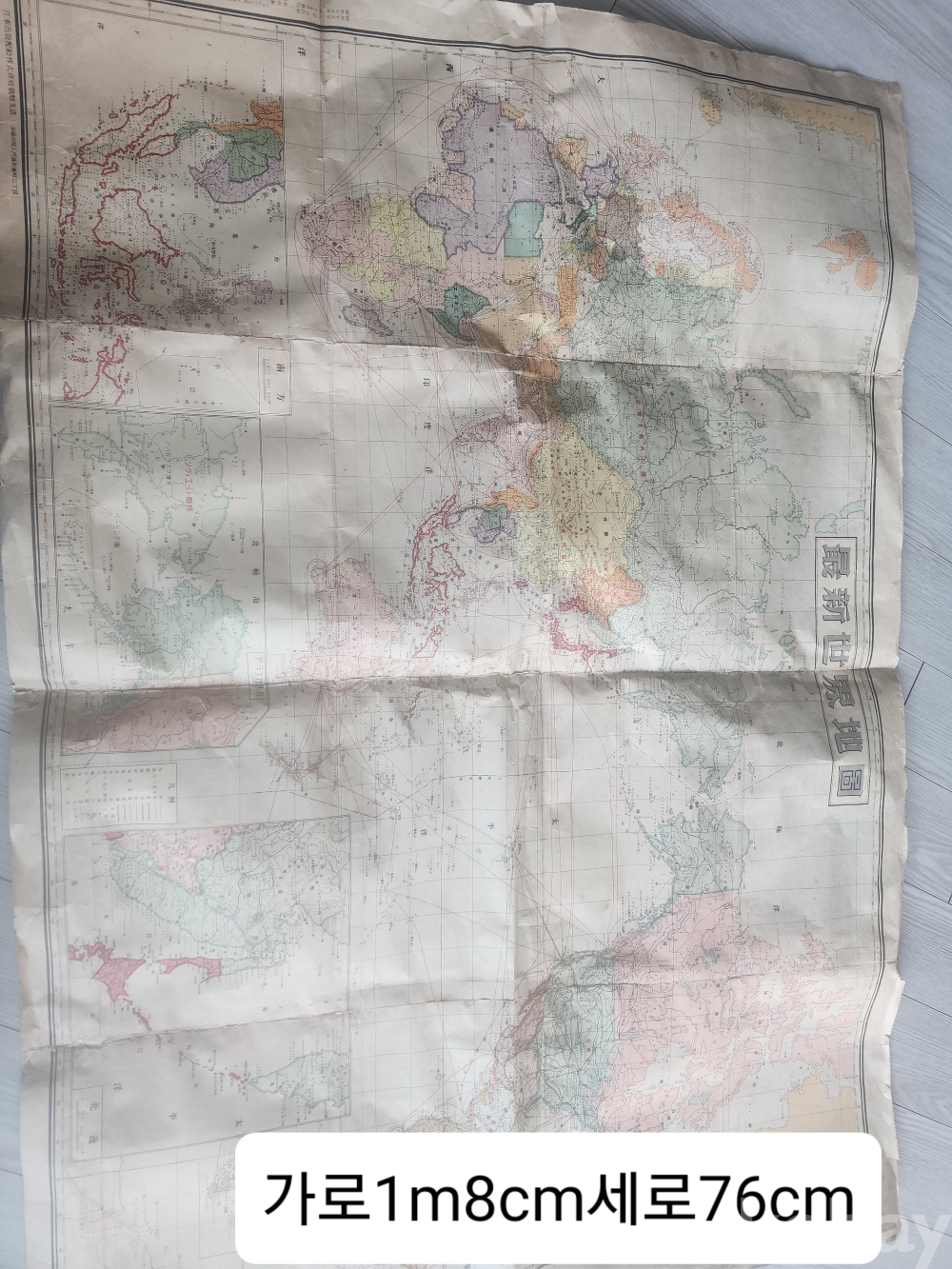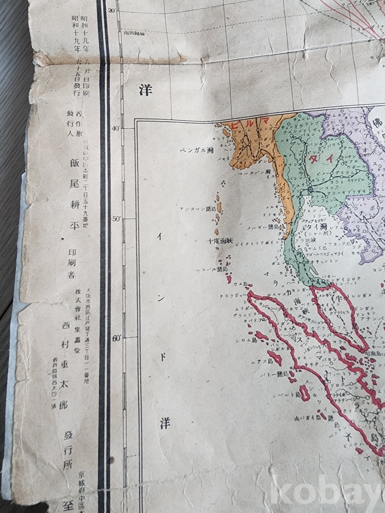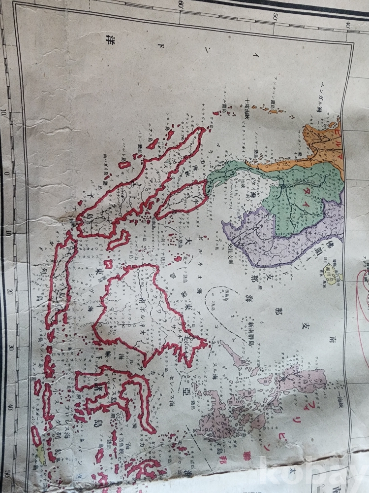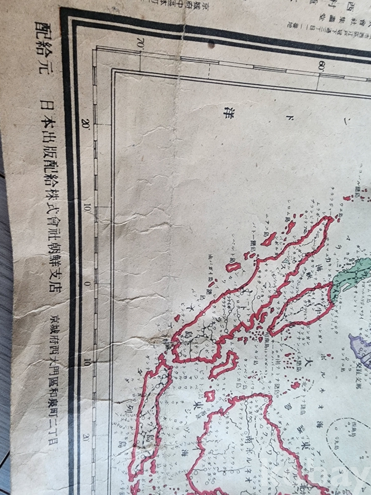 2.역사적 가치: 제2차 세계대전 말기 일제강점기 경성에서 배급된 지도로,당시의 세계관과 '소남섬(싱가포르)' 등전시 기록된귀한사료입니다.임니다.