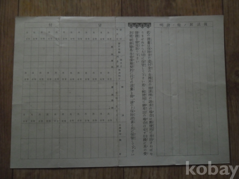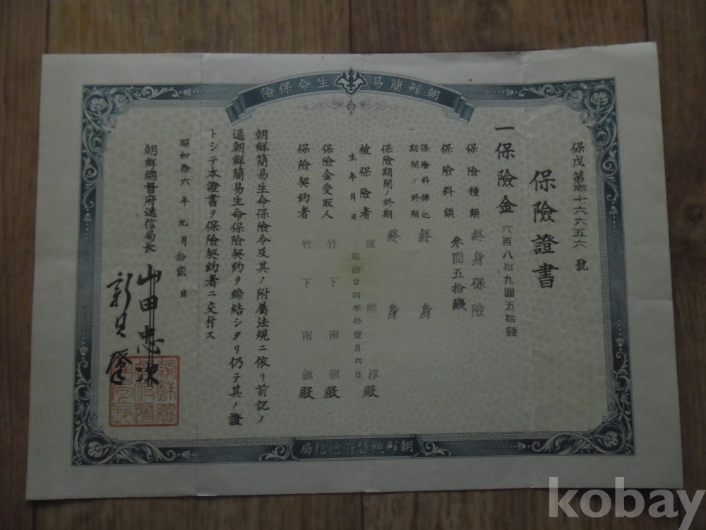 소화16년 조선총독부체신국 발행 보험증서